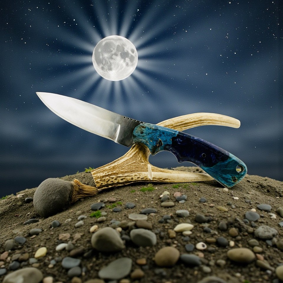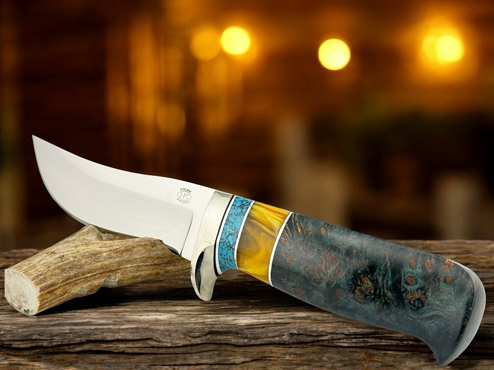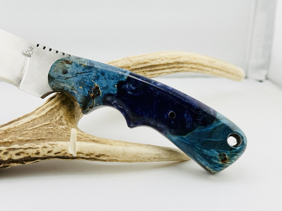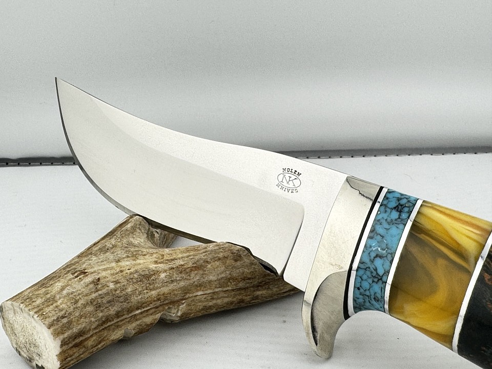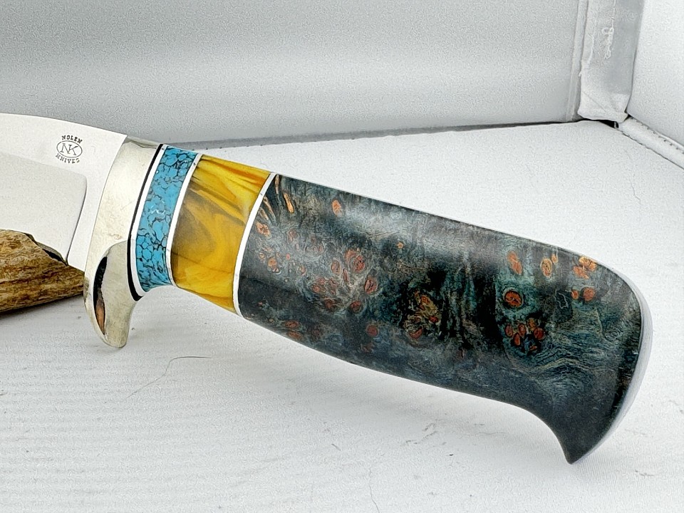 The blade is 4 1/2" with an overall length of 9 1/4". Made with 440c steel. The handle material is stabilized birds eye maple with turquoise and amber spacers. Sheath included. $375.00 + 10.00 shipping