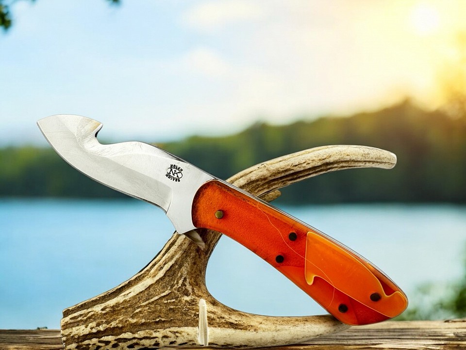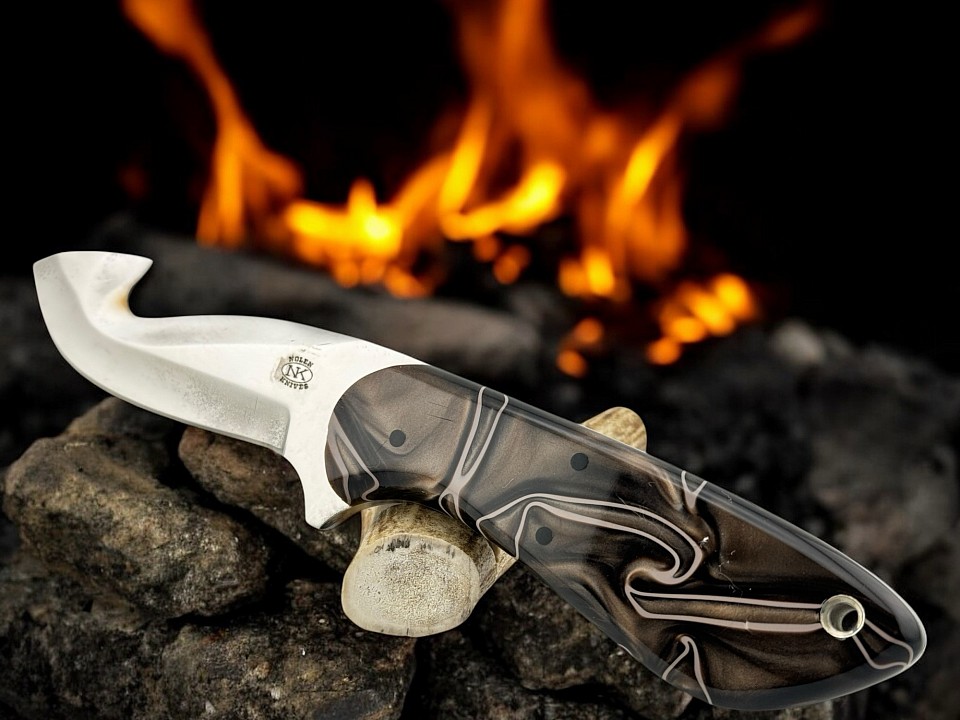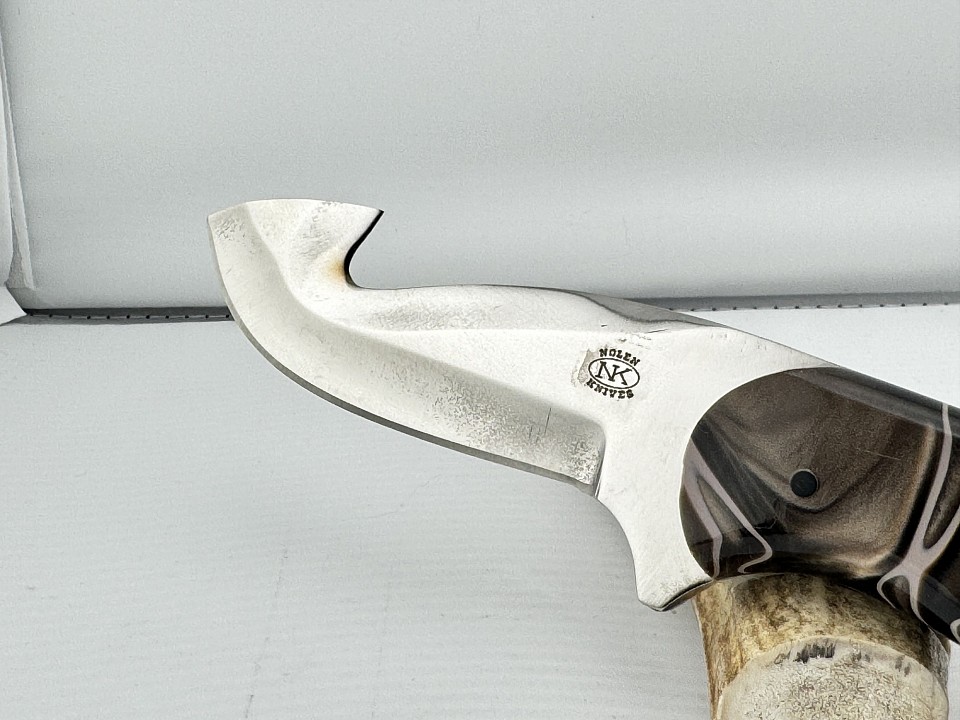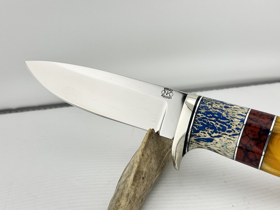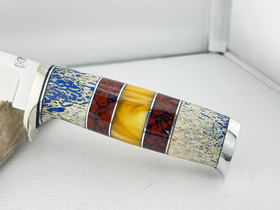 The blade is 4 3/4" with an overall length of 9 1/2". Made with 440c steel. The handle is oosik with red and amber with aluminum spacers and butt cap with a nickel-silver guard. Sheath included. $400.00 + 10.00 shipping