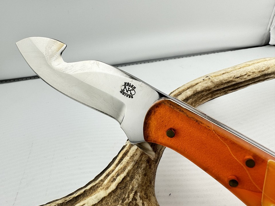 The blade is 3" with an overall length of 6 3/4". Made with 440c steel. The handle material is orange acrylic with red and white spacers. Sheath included. $200.00 + 10.00 shipping