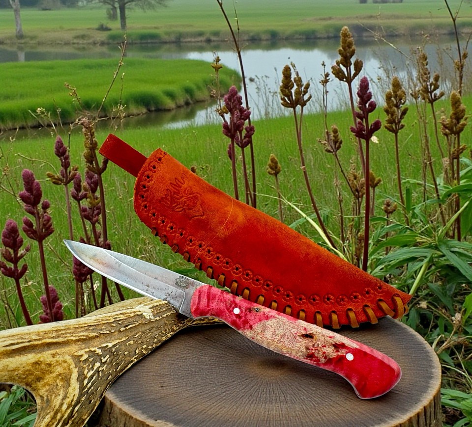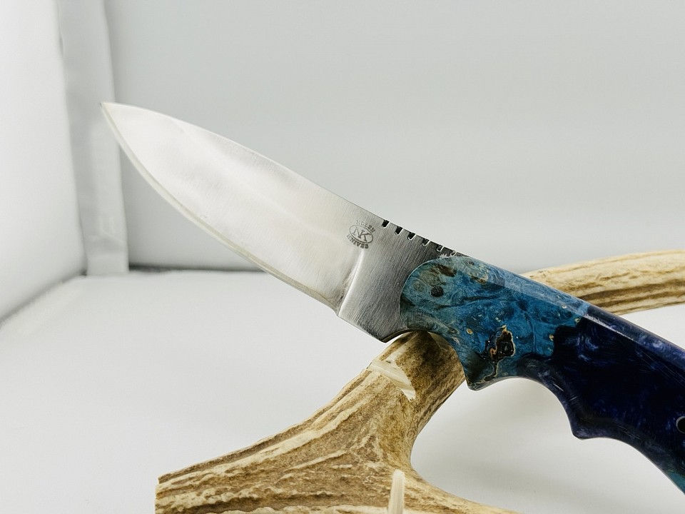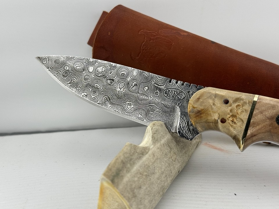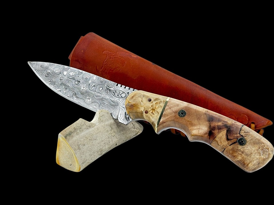 The blade is 4" with an overall length of 8". Made with 440c steel with a tempered oven finish. The handle material is stabilized tiger tail maple burro. Sheath included. $135.00 + 10.00