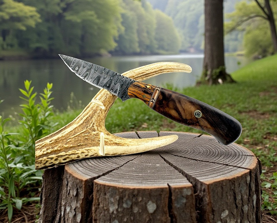 The blade is 4" with an overall length of 9". Made with Damascus steel. The handle material is birdseye maple and maple burro with mosaic pins. Sheath included. $300.00 + 10.00 shipping