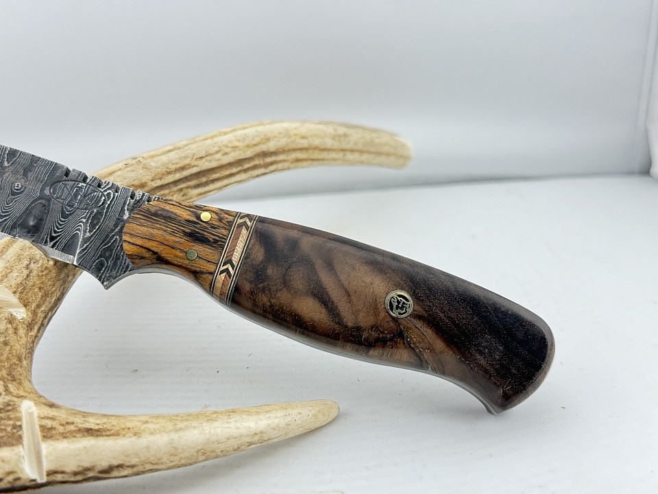 The blade is 3" with an overall length of 7 1/2". Made with Damascus steel. The handle material is walnut and cocobolo with a mosaic spacer. Sheath included. $225.00 + 10.00 shipping