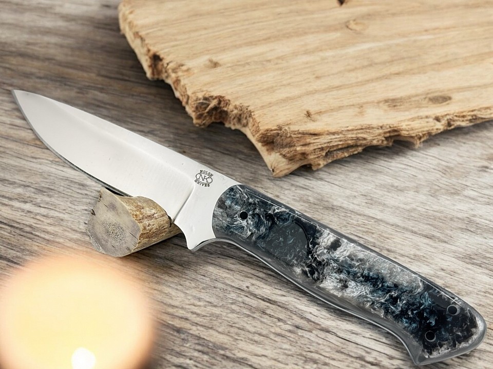 The blade is 4 1/4" with an overall length of 8 1/2". Made with 440c steel with a satin finish. The handle is black ice acrylic. Sheath included. $175.00 + 10.00 shipping