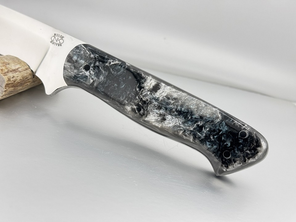The blade length is 4 1/2" with an overall length of 9". Made with D2 steel. The handle material is white ash with a rosin center. Sheath included. $275.00 + 10.00 shipping