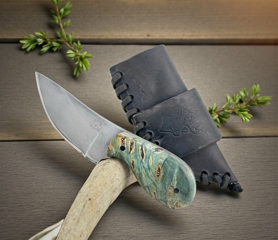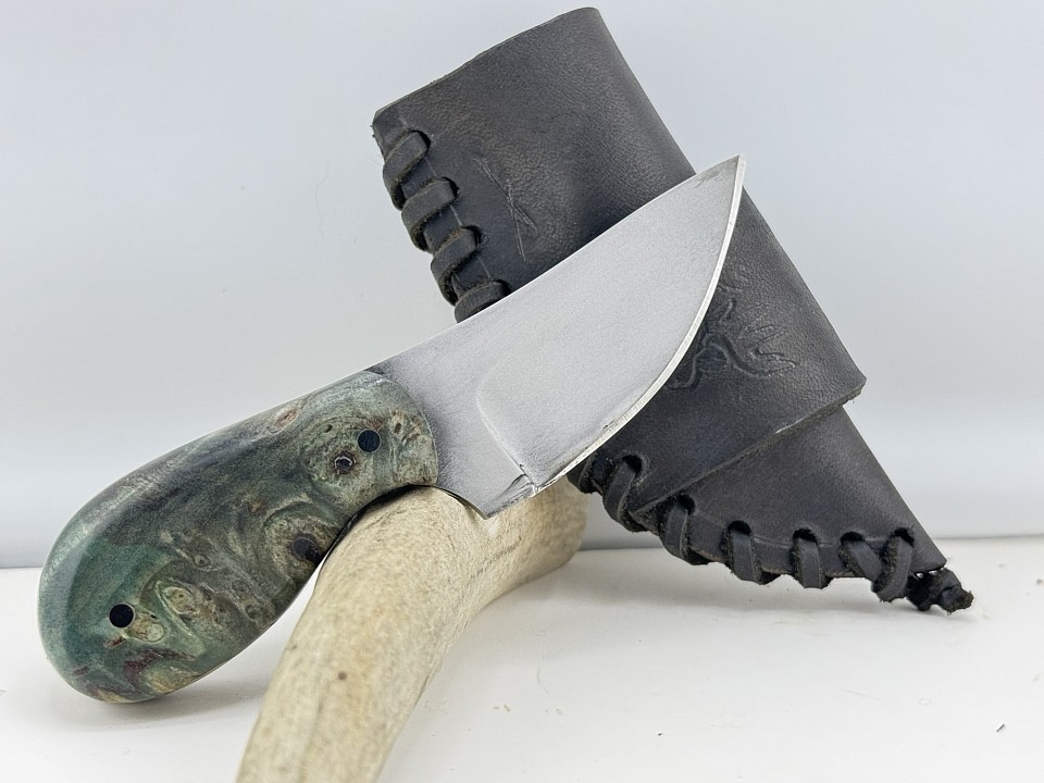 The blade is 2 1/2" with an overall length of 5". Made with 440c steel with a bead blast finish. The handle material is stabilized maple burl. Sheath included. $150.00 + 10.00 shipping