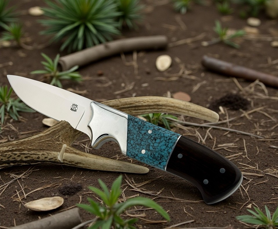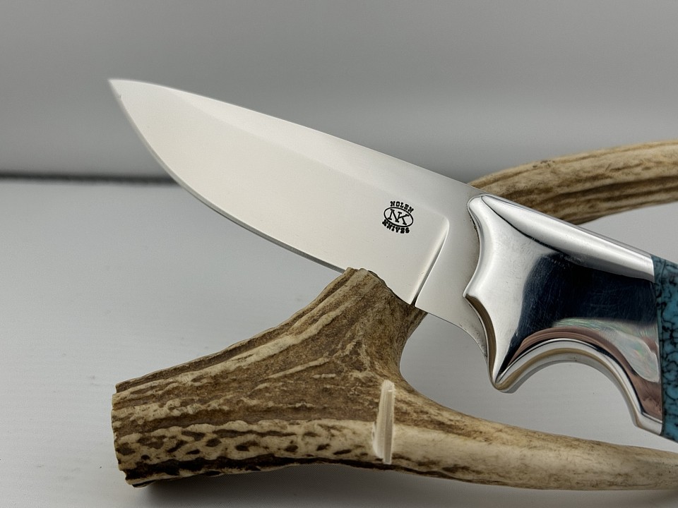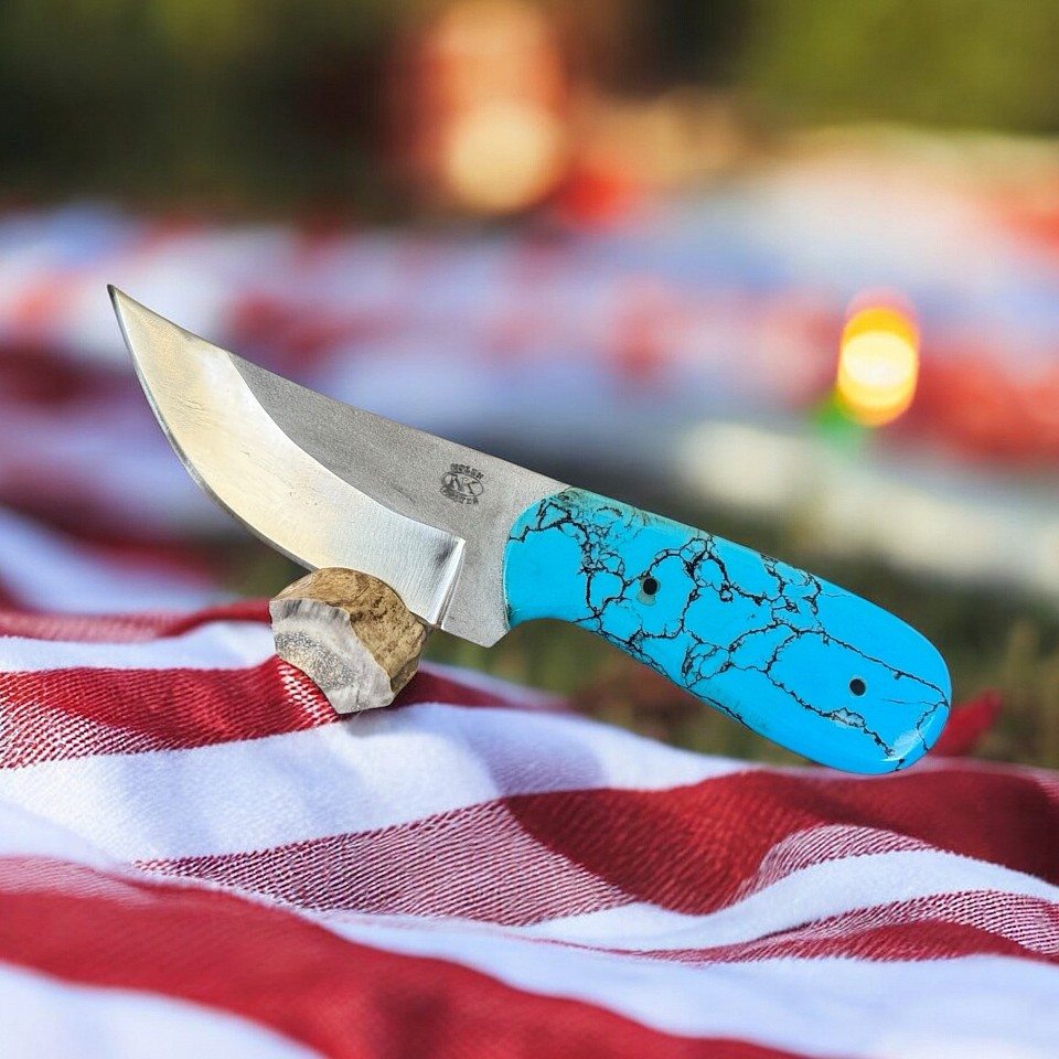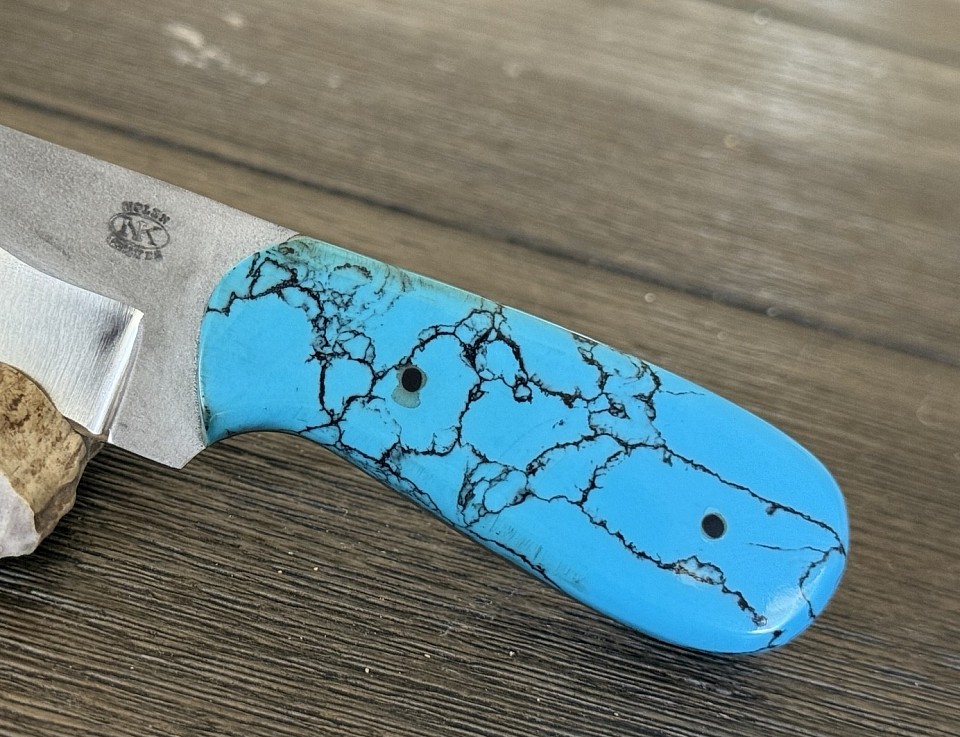 The blade is 3 1/2" with an overall length of 6 1/2". Made with 440c steel. The handle is man-made turquoise. Sheath included. $165.00 + 10.00 shipping
