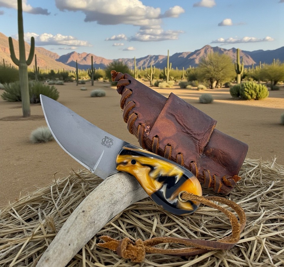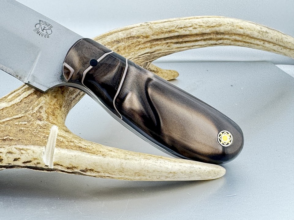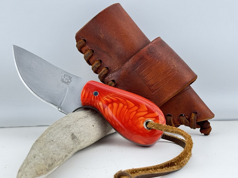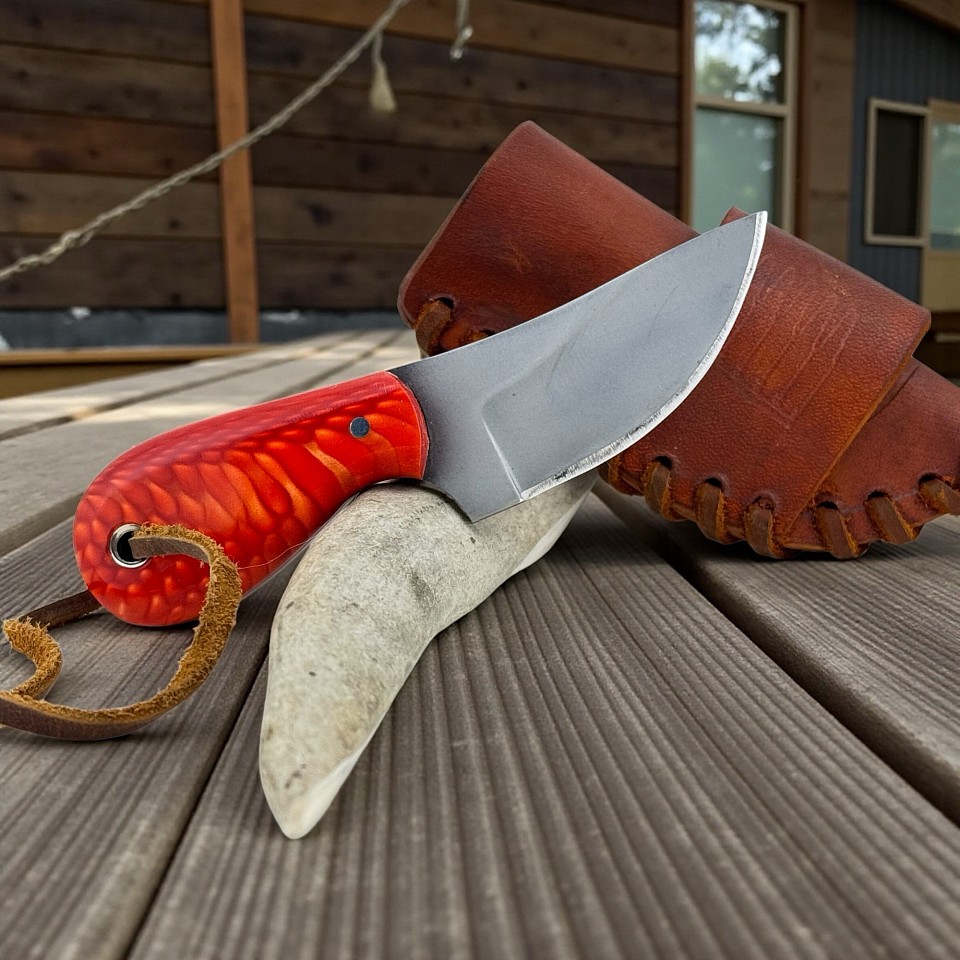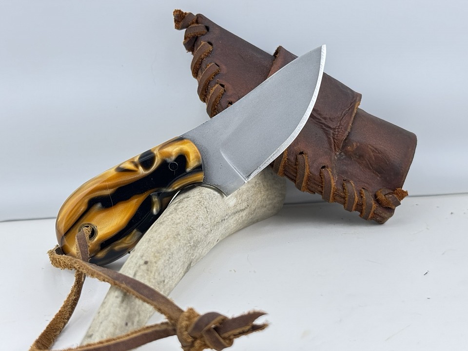 The blade length is 2 1/2" with an overall length of 5". Made with 440c with a bead blast finish. The handle material is dragon skin acrylic. Sheath included. $150.00 + 10.00 shipping