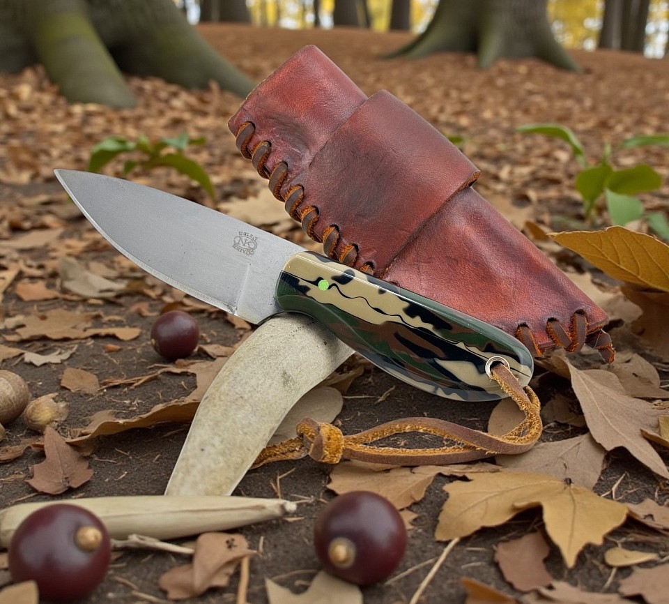 The blade length is 3" with an overall length of 6 1/2". Made with 440c. with a bead blast finish. The handle material is camo acrylic. Sheath included. $175.00 + 10.00 shipping