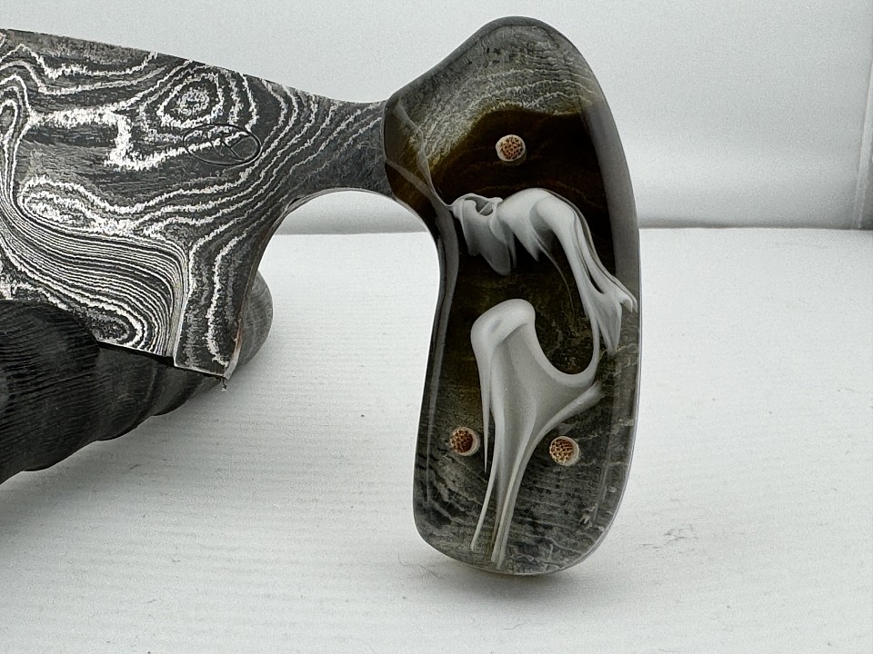 The blade is 4" with an overall length of 5". Made with Damascus steel. The handle is brown/white/clear acrylic. Sheath included. $250.00 + 10.00 shipping