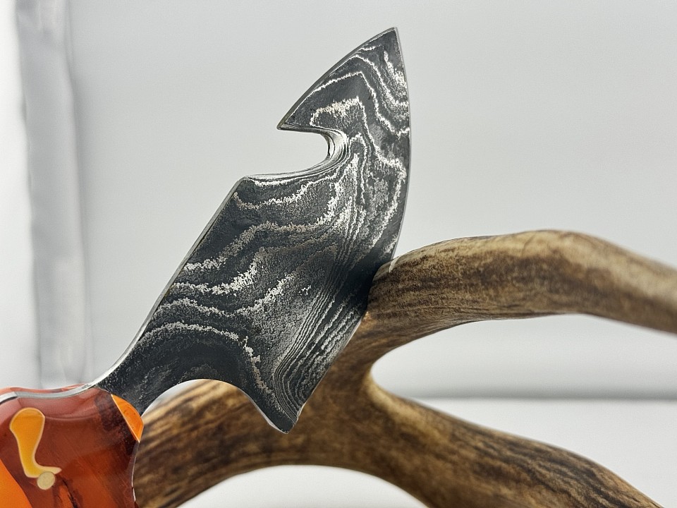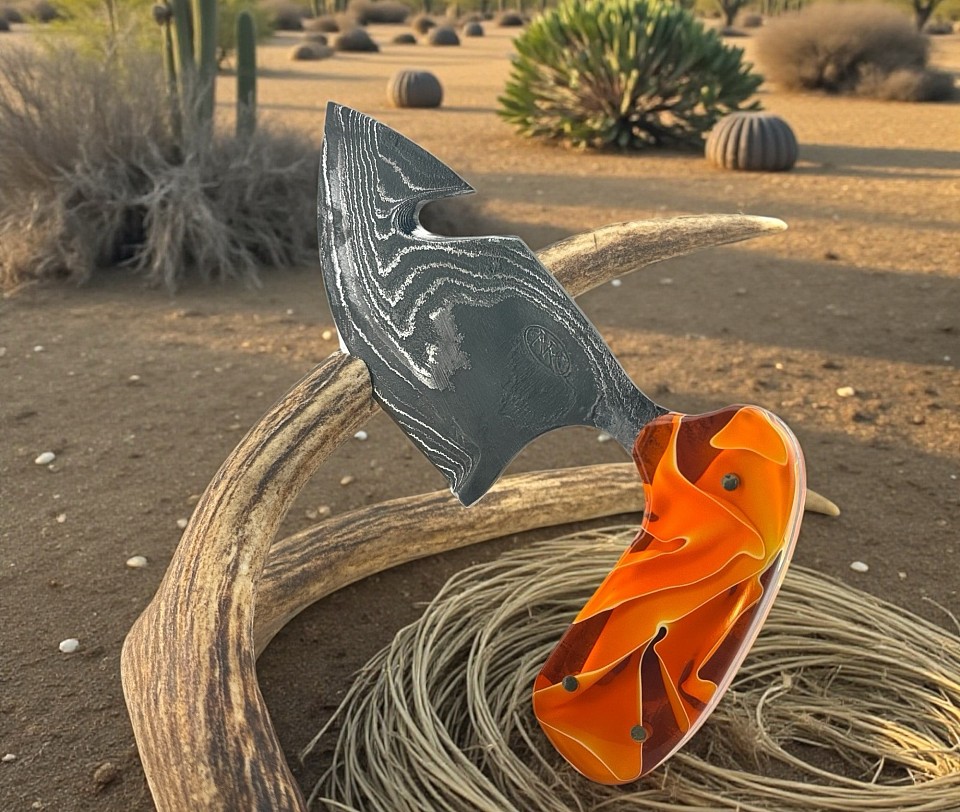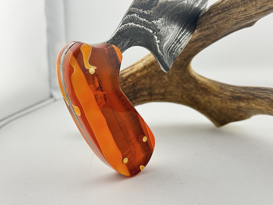 The blade is 4" with an overall length of 5 1/2". Made with Damascus steel. The handle is orange acrylic. Sheath included. $245.00 + 10.00 shipping