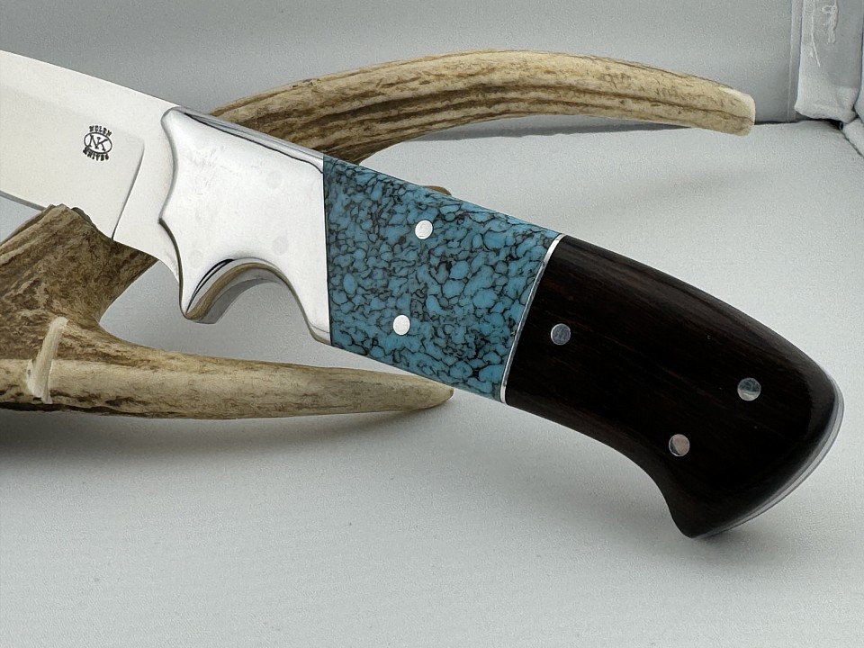 The blade is 4 3/8" with an overall length of 9 5/8". Made with 440c steel. The handle is man-made turquoise with cocobolo and aluminum bolster. Sheath included. $400.00 + 10.00 shipping