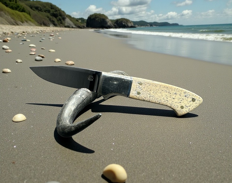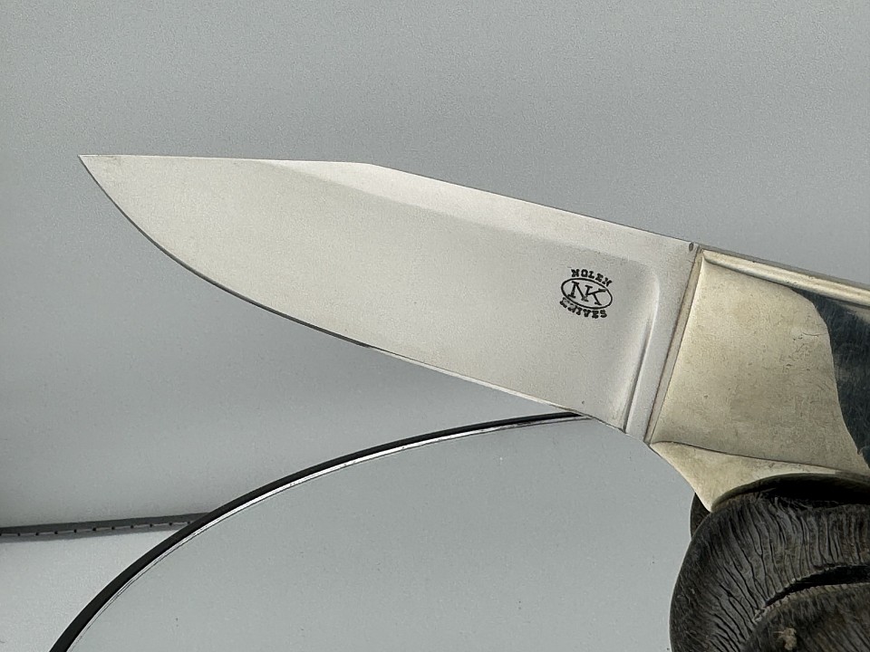 The blade is 4 1/8" with an overall length of 9". Made with 440c steel. The handle is blue dyed oosik with a nickel silver bolster. Sheath included. $400.00 + 10.00 shipping