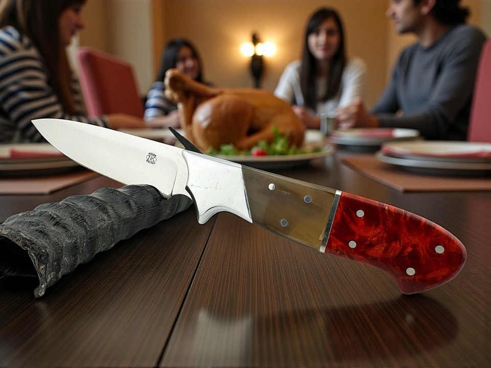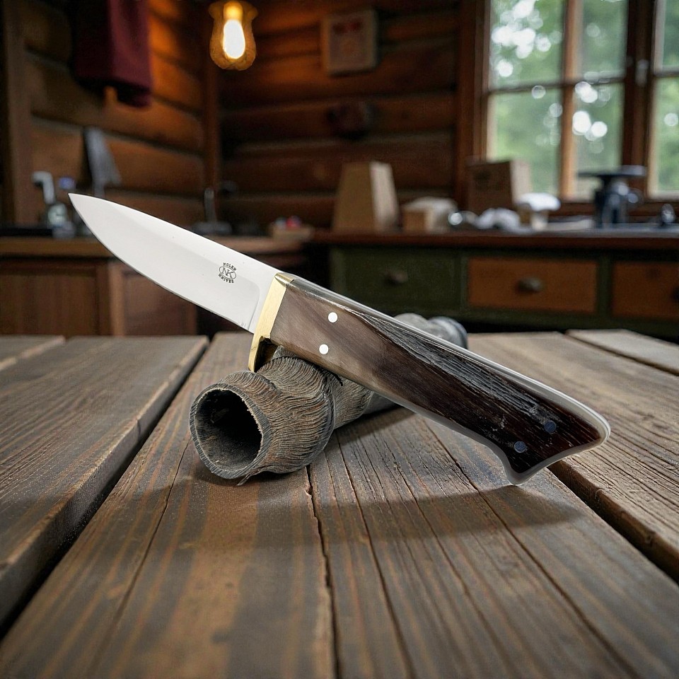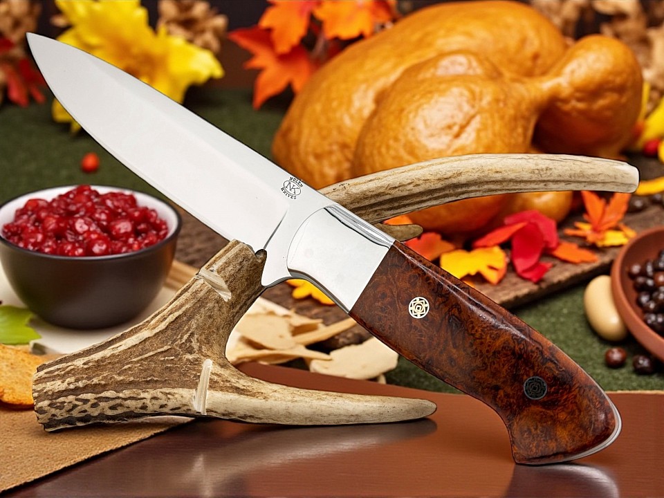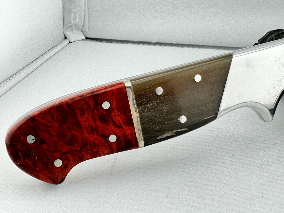The blade is 5 1/4" with an overall length of 10 3/4". Made with 440c steel. The handle is kudu horn and stabilized maple burl with an aluminum bolster. Sheath included. $375.00 + 10.00 shipping