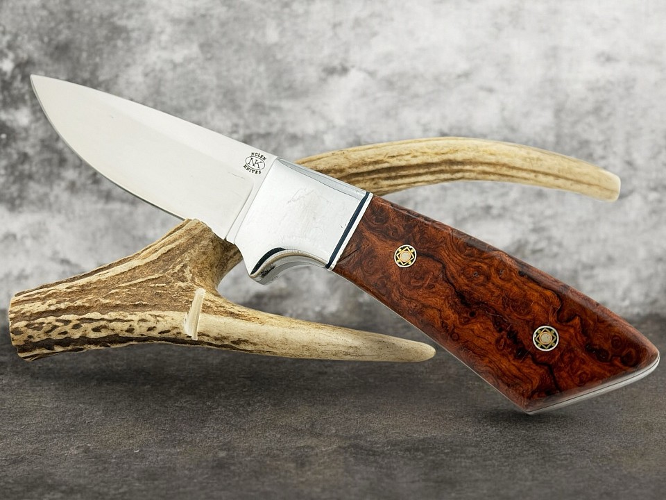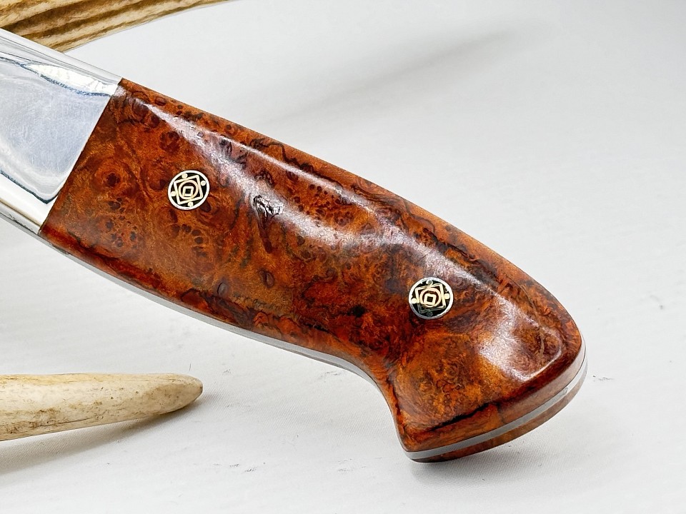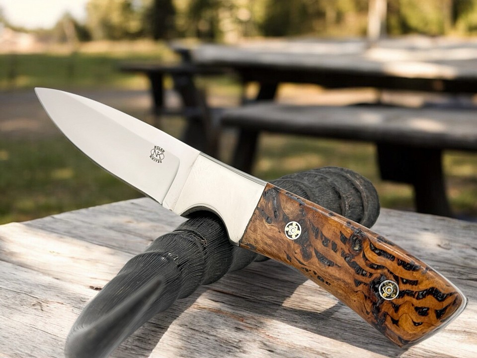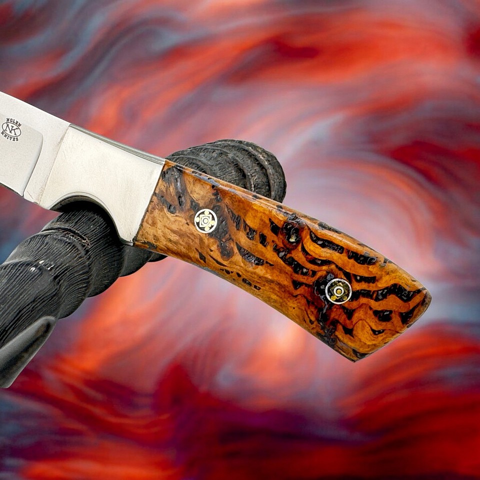 The blade is 4 1/4" with an overall length of 9 1/4". Made with 440c steel. The handle is birdseye maple burl with an aluminum bolster. Sheath included. $375.00 + 10.00 shipping