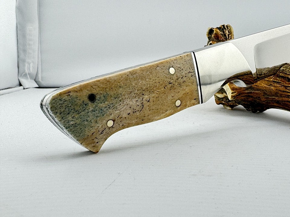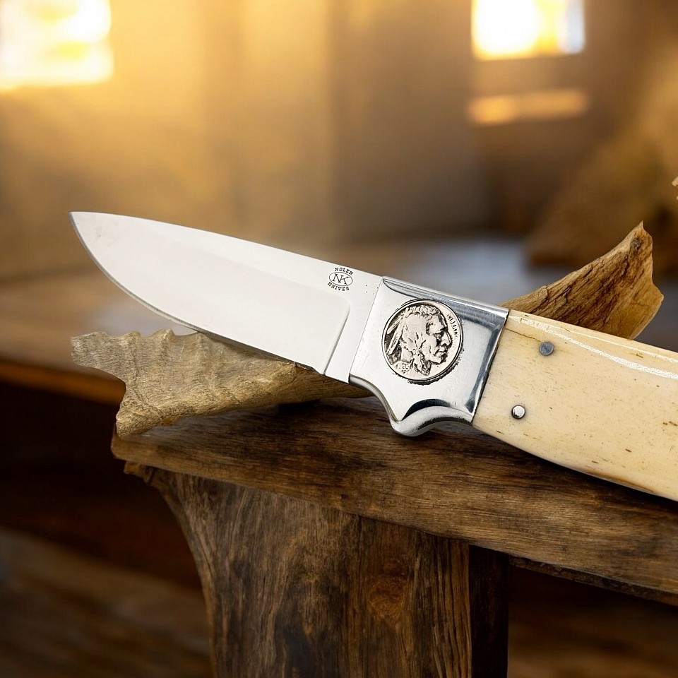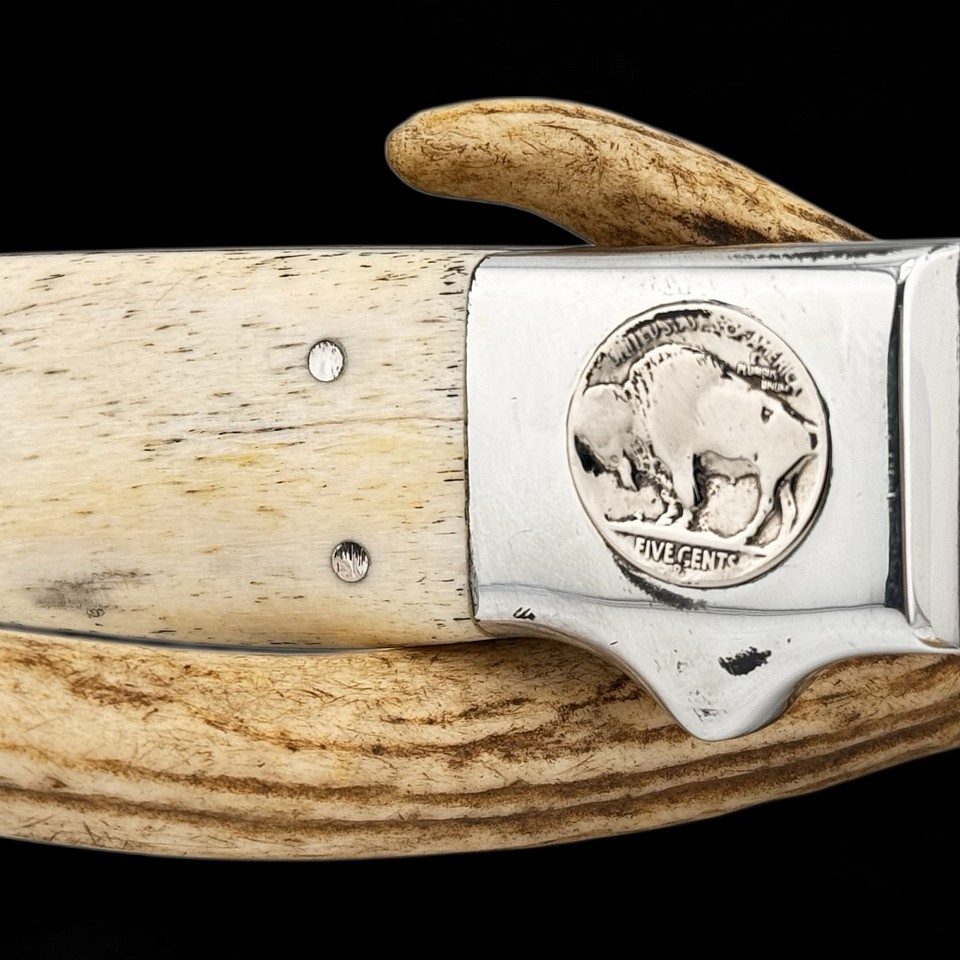 The blade is 4 1/2" with an overall length of 9 3/4". Made with 440c steel. The handle is giraffe bone with a nickel-silver bolster with an inlaid nickel and buffalo head nickel. Sheath included. $545.00 + 10.00 shipping