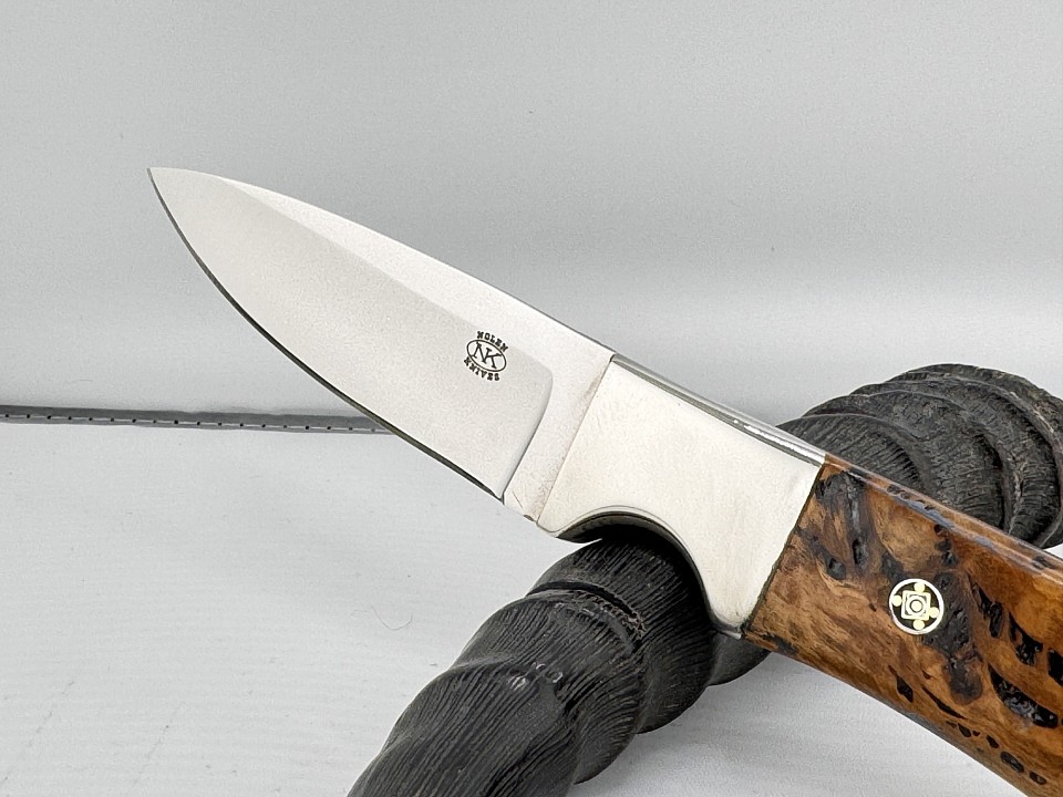 The blade length is 4" with an overall length of 8 3/8". Made with 440c steel. The handle material is stabilized maple burl with a nickel-silver bolster. Sheath included. $300.00 + 10.00 shipping