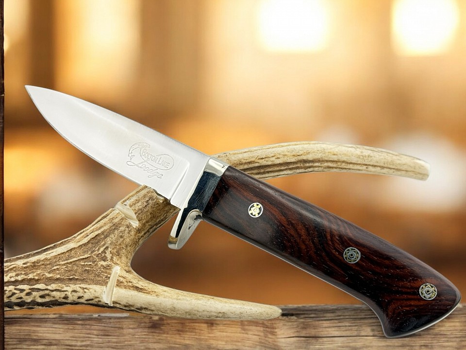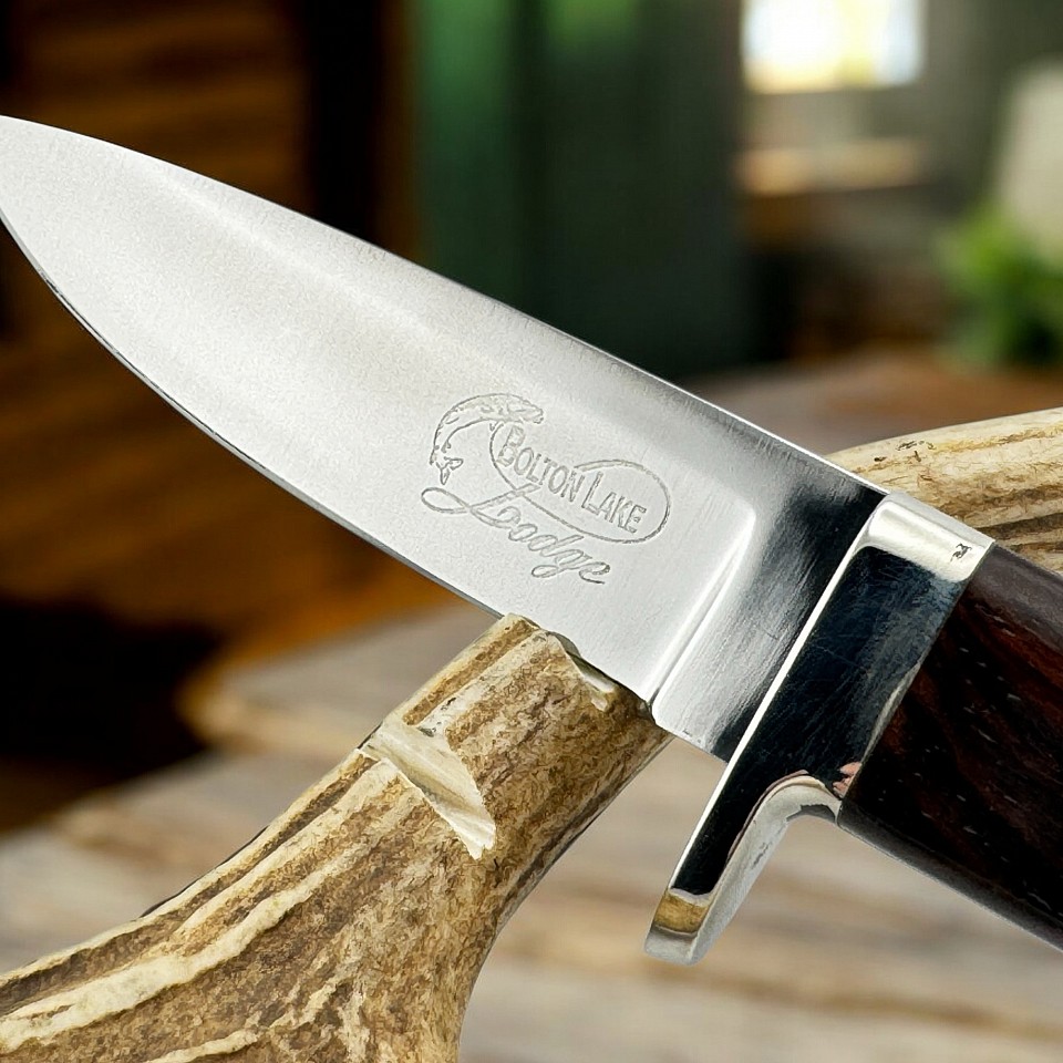 The blade is 4 1/2" with an overall length of 9 1/8". Made with 440c steel with engraving of 'Bolton Lake Lodge". The handle is staabilized cocobolo with a nickel-silver guard. Sheath included. $375.00 + $10.00 shipping.