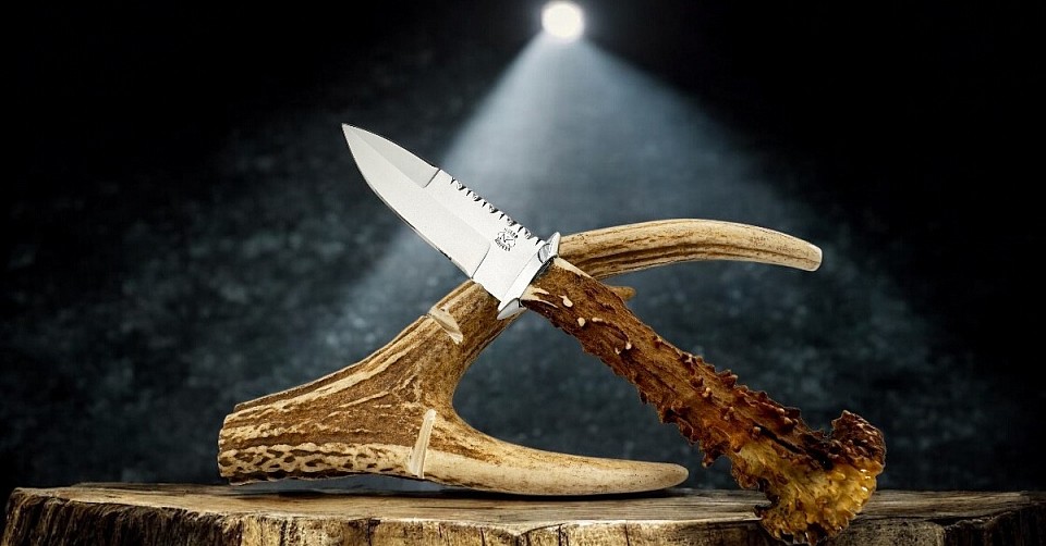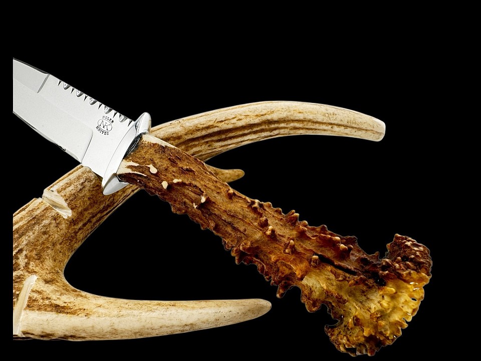 The blade is 4' with an overall length of 8". Made with 440c. The handle is Roe Buck Horn with an aluminum guard. Sheath included. $200.00 + 10.00 shipping