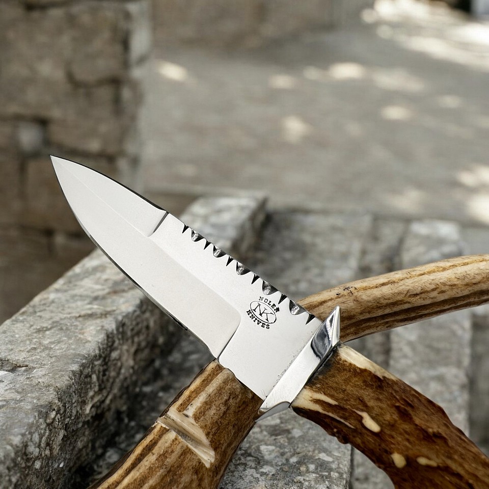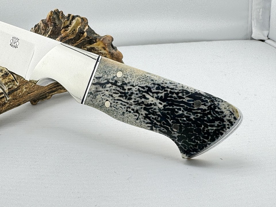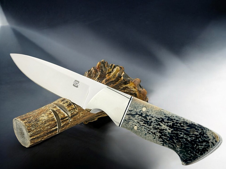 The blade is 5" with an overall length of 9 1/2". Made with 440c steel. The handle is blue oosik with a nickel-silver bolster. Sheath included. $350.00 + 10.00 shipping