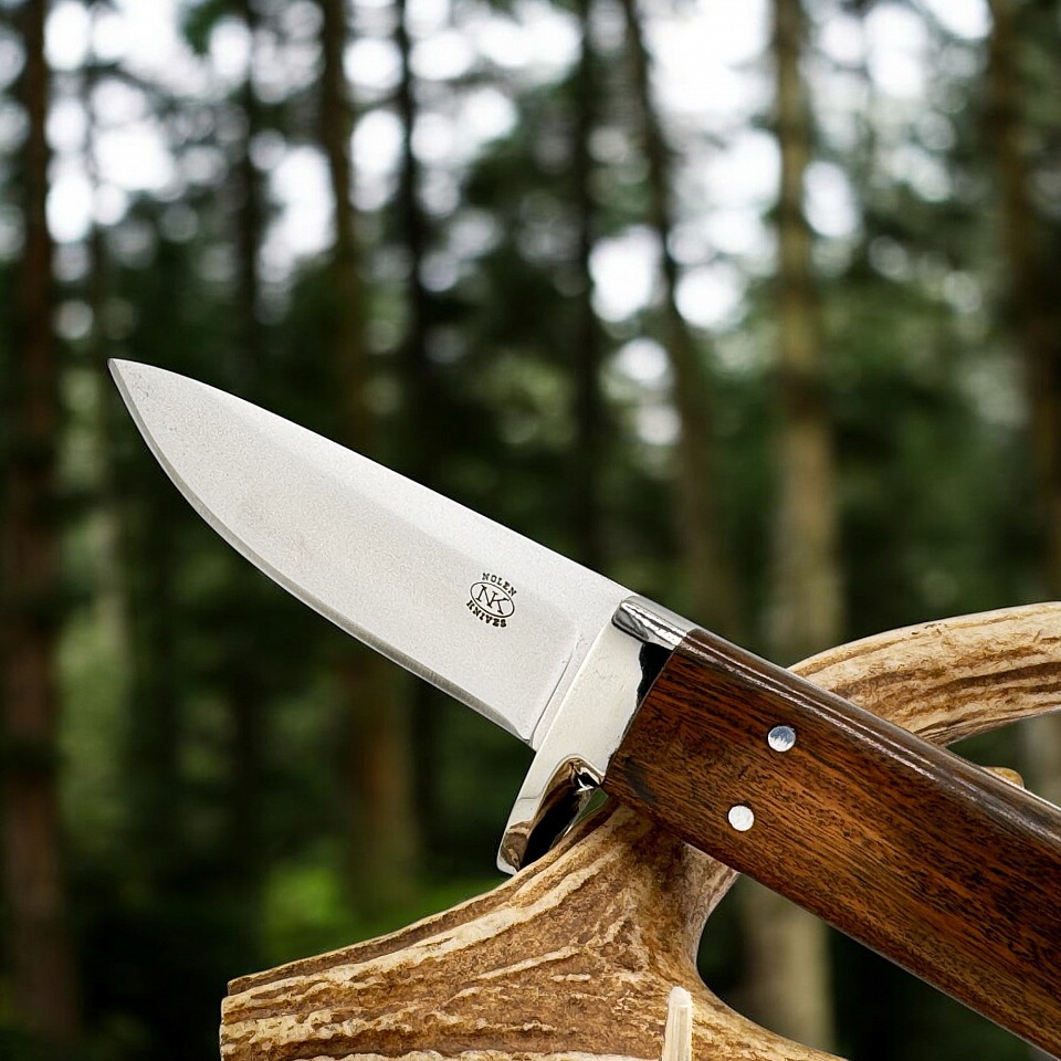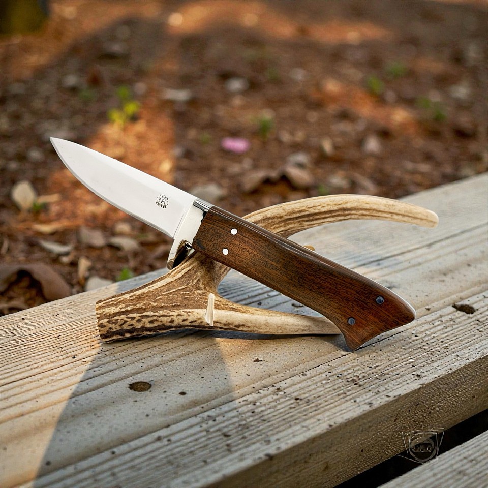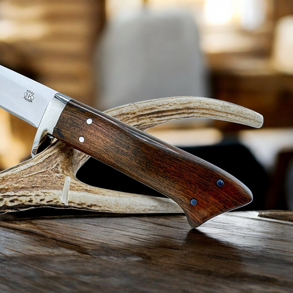 The blade is 4" with an overall length of 8 1/2". Made with 440c steel. The handle is cocobolo with a nickel-silver guard. Sheath included. $325.00 + 10.00 shipping