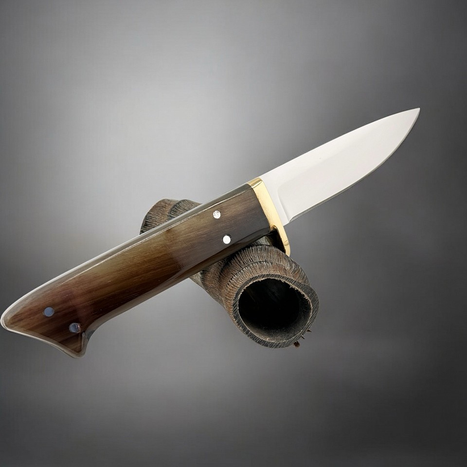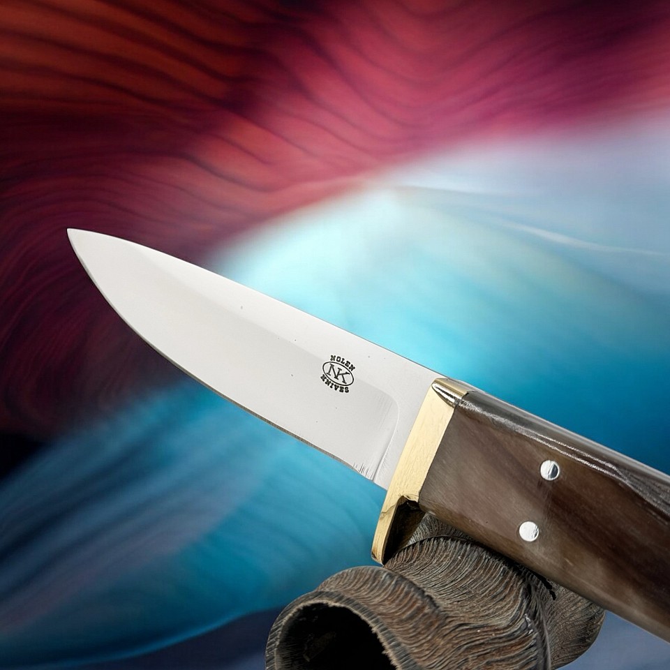 The blade is 4" with an overall length of 8 1/2". Made with 440c steel. The handle is kudu horn with a brass guard. Sheath included. $325.00 + 10.00 shipping
