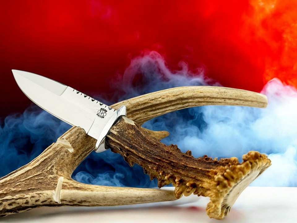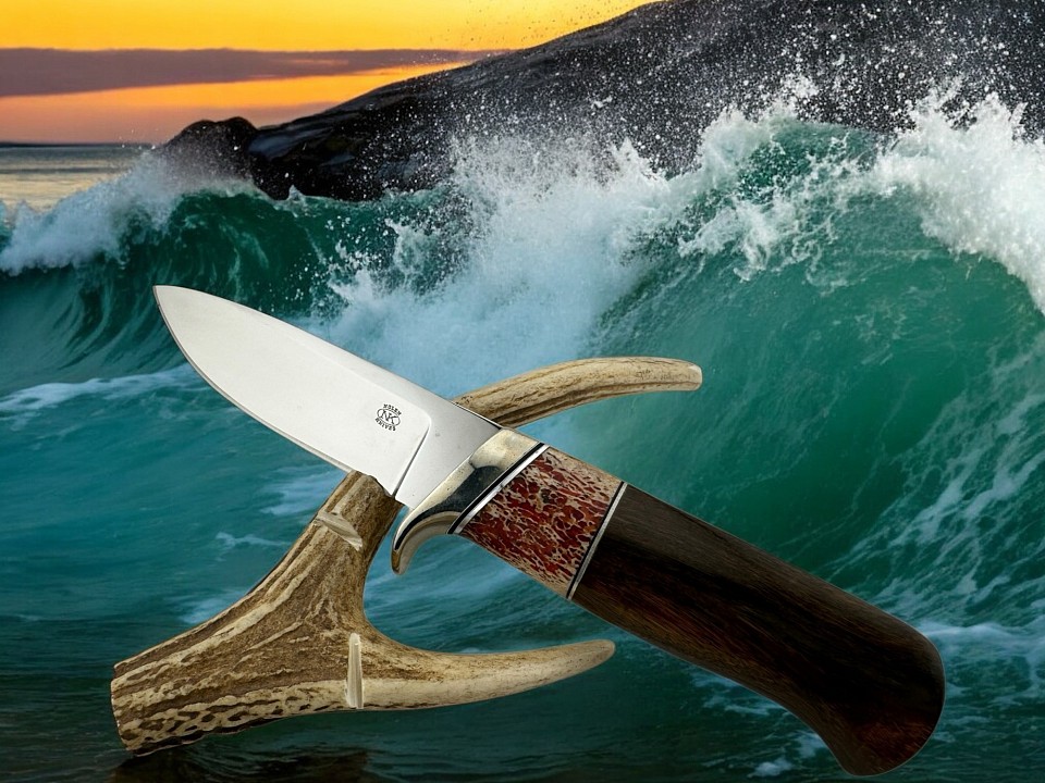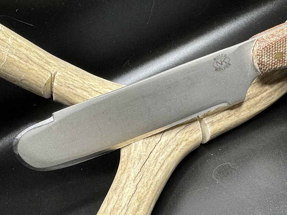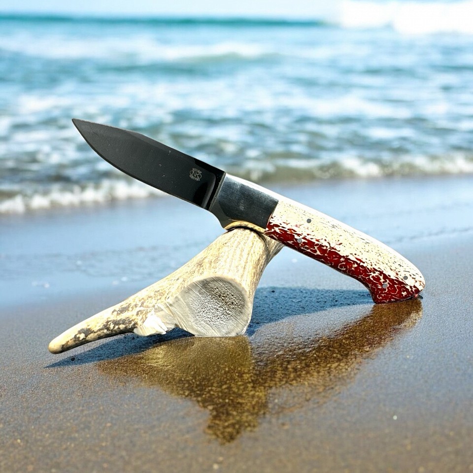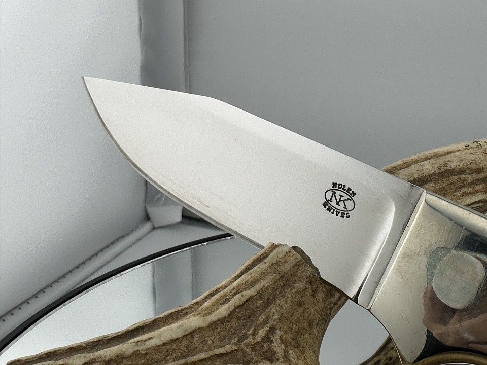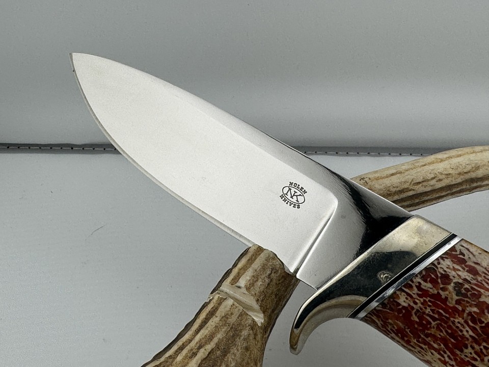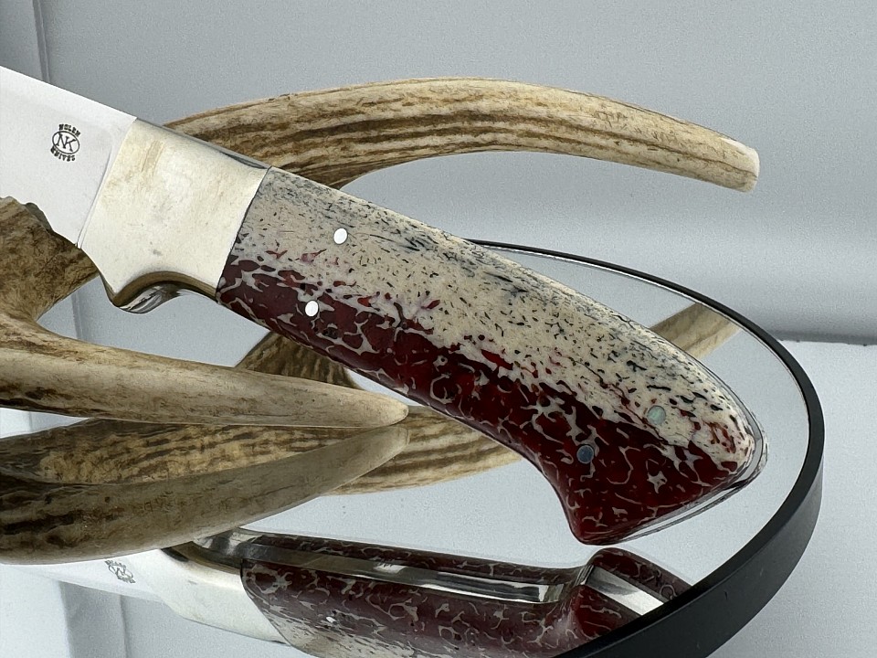 The blade is 4 1/8" with an overall length of 9". Made with 440c steel. The handle is red-dyed oosik with a nickel-silver bolster. Sheath included. $300.00 + $10.00 shipping