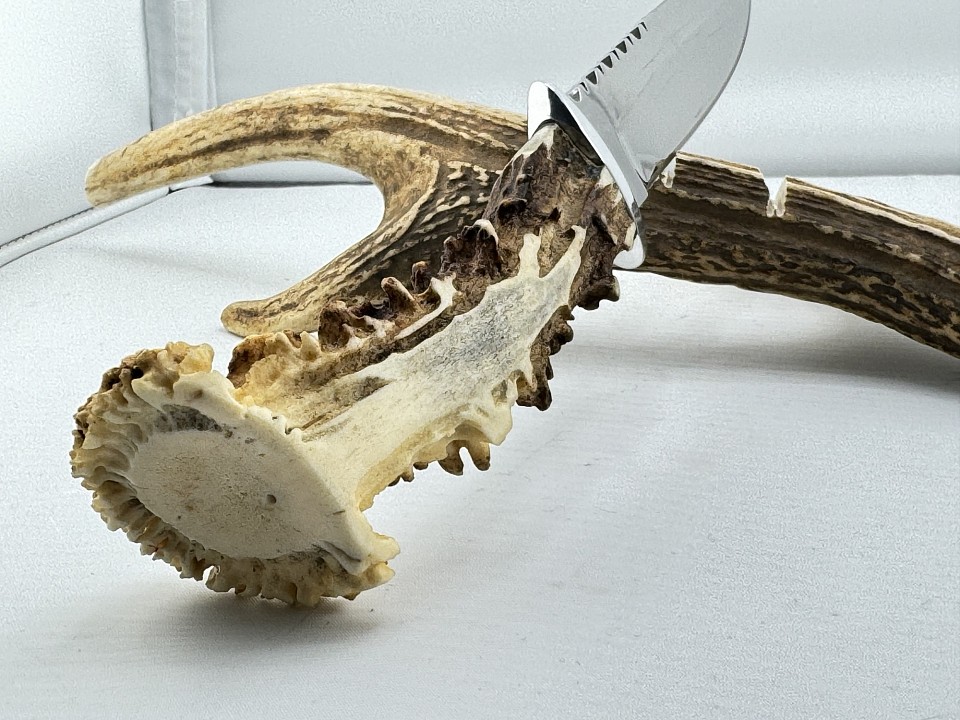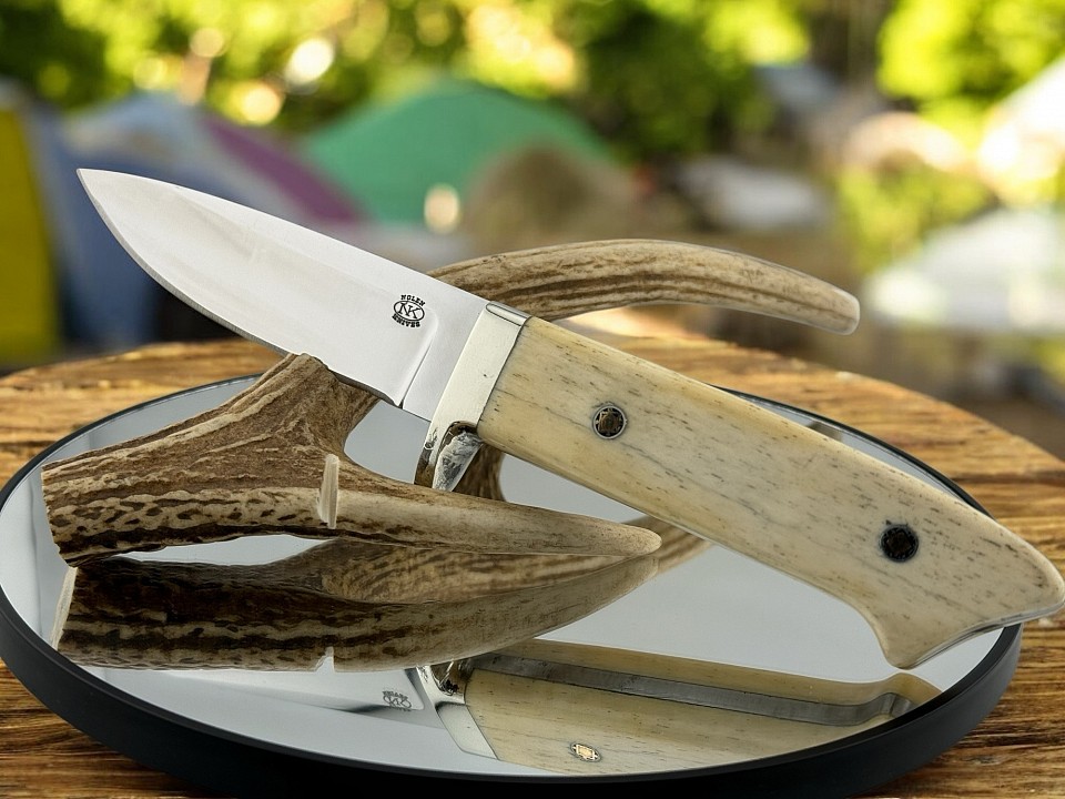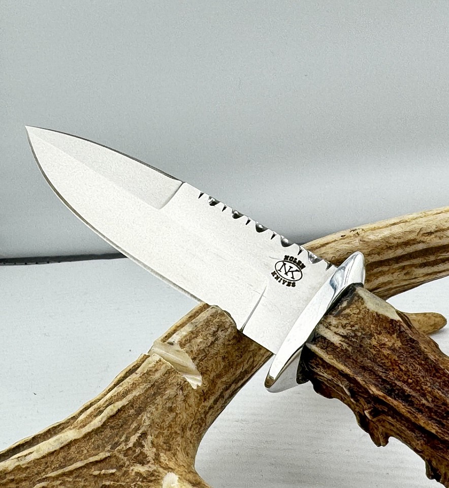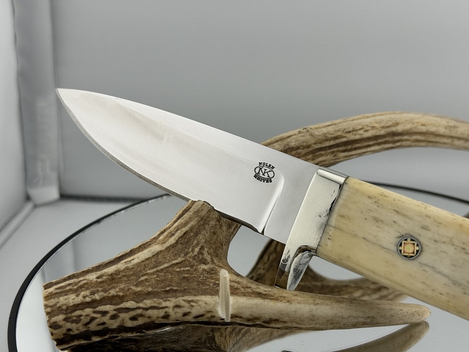 The blade is 4 1/2" with an overall length of 9 1/4". Made with 440c steel. The handle is camel bone with a nickel-silver guard. Sheath included. $375.00 + $10.00 shipping