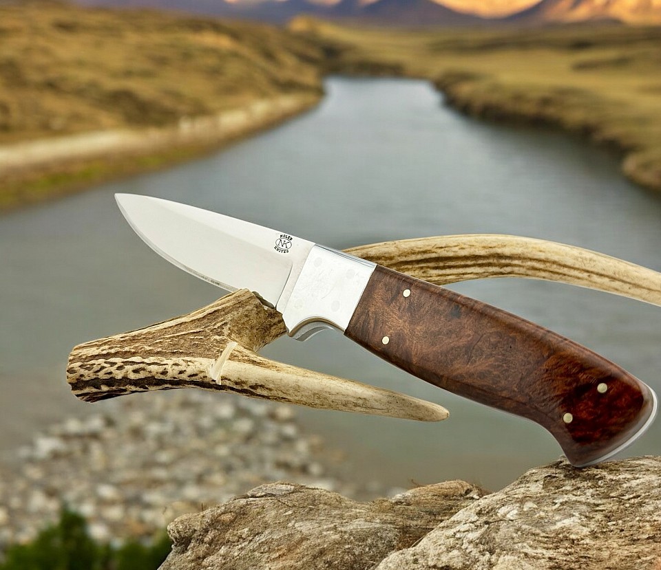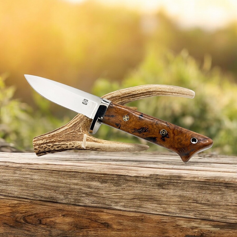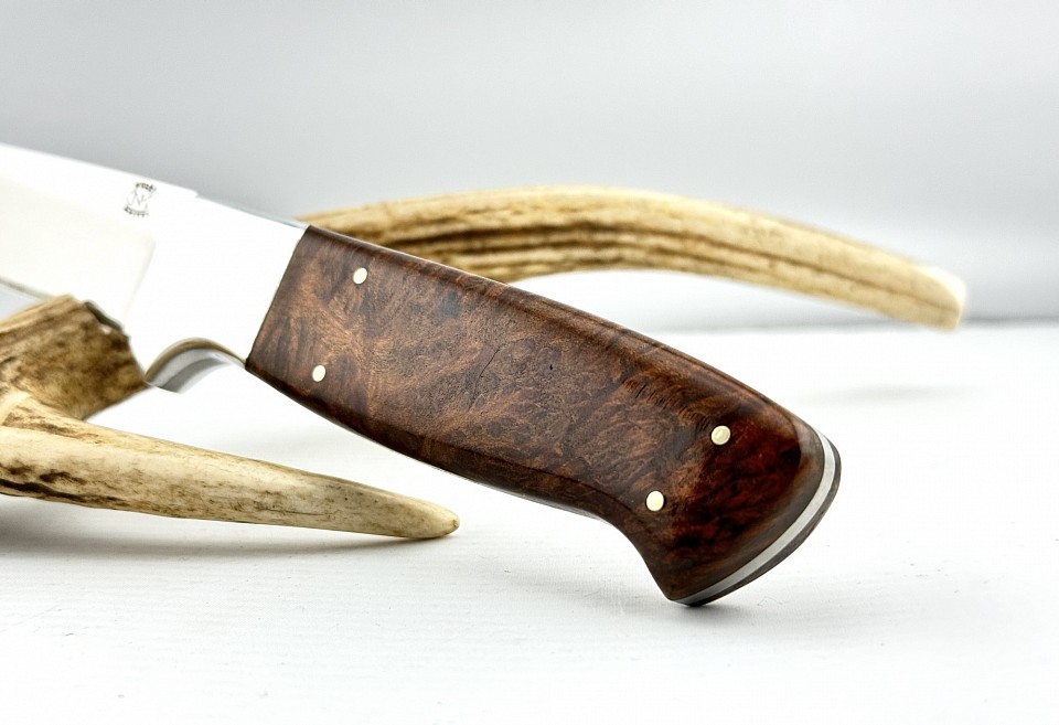 The blade is 4 1/4" with an overall length of 9 3/8". Made with 440c steel. The handle is presentation burl scales with a nickel-silver guard. Sheath included. $350.00 + 10.00 shipping.