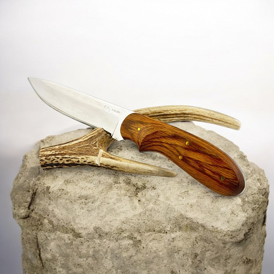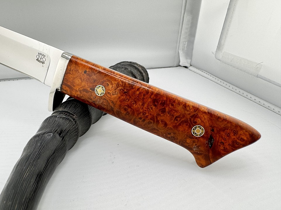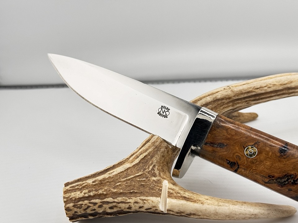 The blade is 4 5/8" with an overall length of 9 3/8". Made with 440c steel. The handle is stabilized birds-eye maple with a nickel-silver guard. Sheath included. $300.00 + 10.00 shipping