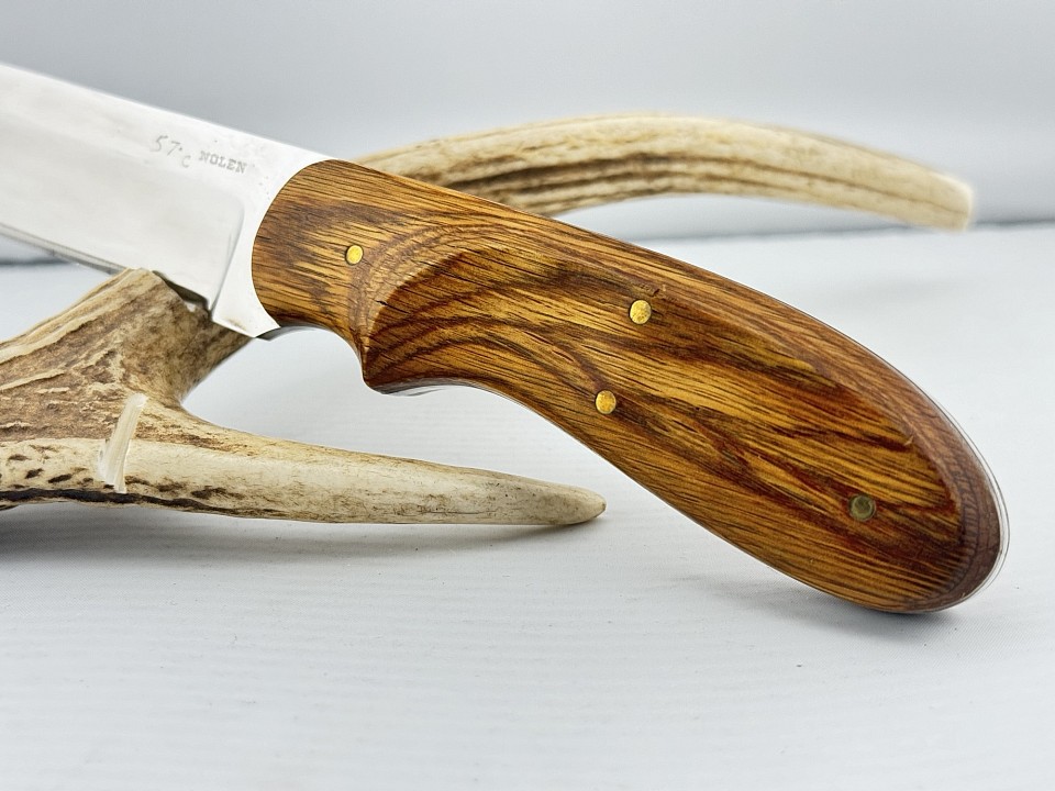 The blade is 5" with an overall length of 9 3/8". Made with 440c steel. The handle material is oosik and cocobolo with a nickel-silver guard. Sheath included. $350.00 + 10.00 shipping