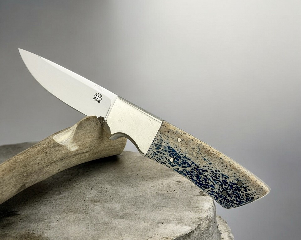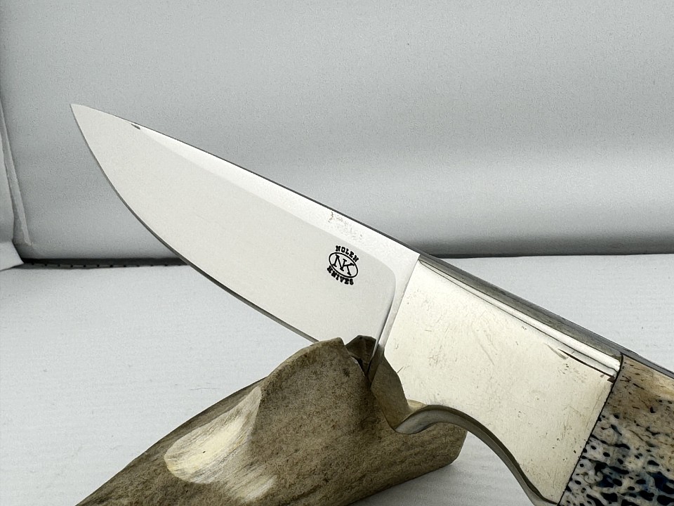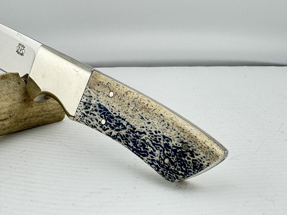 The blade is 4 1/4" with an overall length of 9". Made with 440c steel. The handle is blue dyed oosik with a nickel-silver bolster. Sheath included. $350.00 + 10.00 shipping