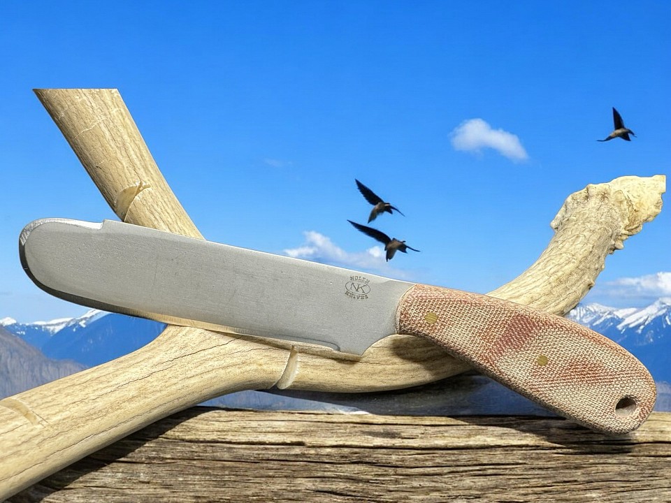 The blade is 5 3/8" with an overall length of 9 7/8". Made with 440c steel. The handle is Light Colorado Micarta with brass pins. Sheath included. $250.00 + 10.00 shipping