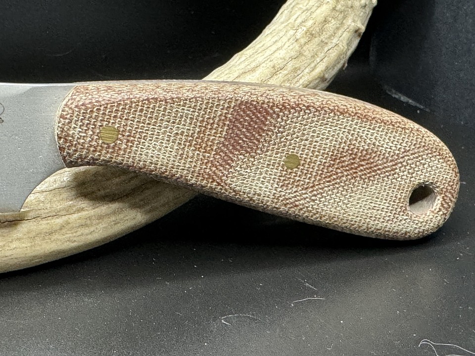 The blade is 4 1/8" with an overall length of 7 5/8". The handle is brown canvas micarta. Sheath included. $125.00 + 10.00 shipping.