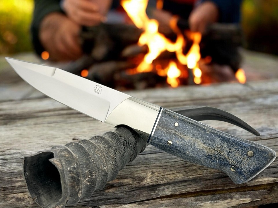 The blade is 5" with an overall length of 10". Made with 440c steel.. The handle is certified dinosaur dung with a nickel-silver bolster. Sheath included. $500.00.+ 10.00 shipping