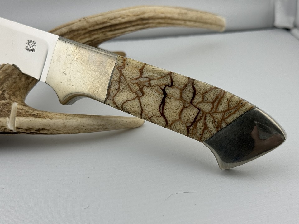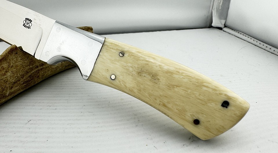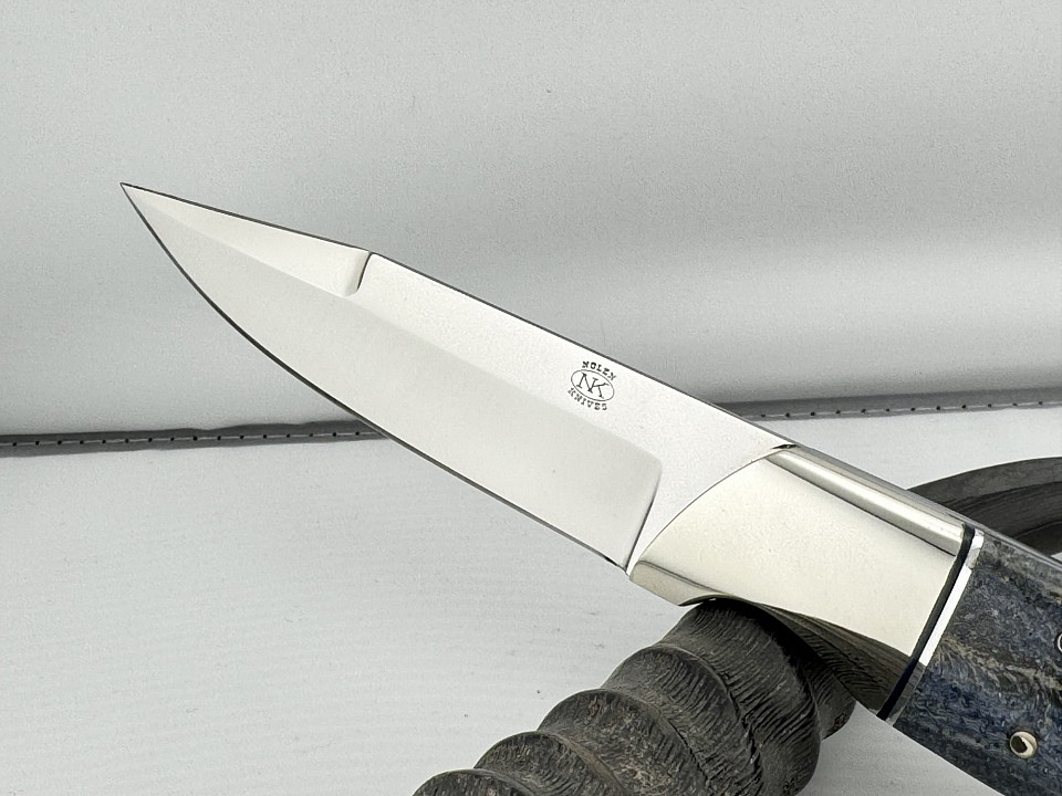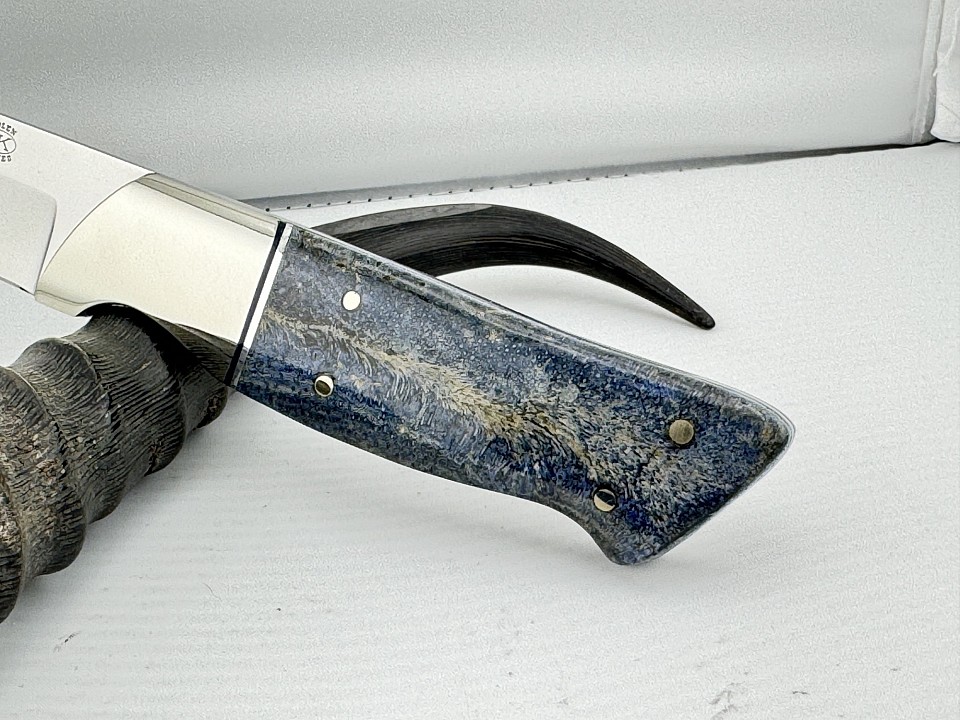 The blade is 4 3/4" with an overall length of 9 1/2". Made with 440c steel. The handle material is kudu horn with an aluminum bolster. Sheath included. $375.00 + 10.00 shipping