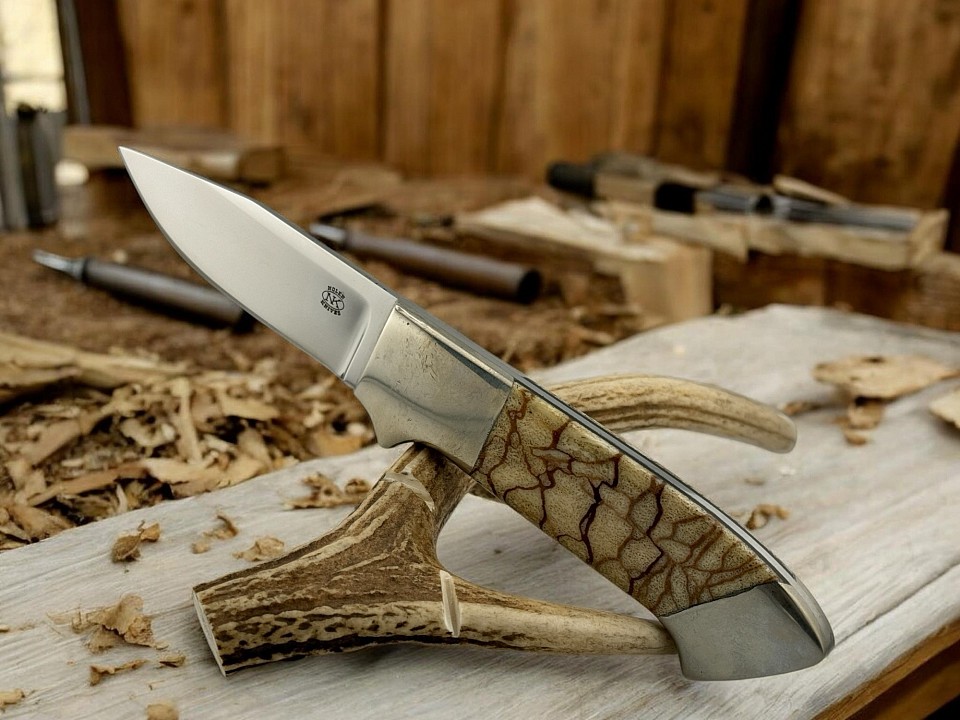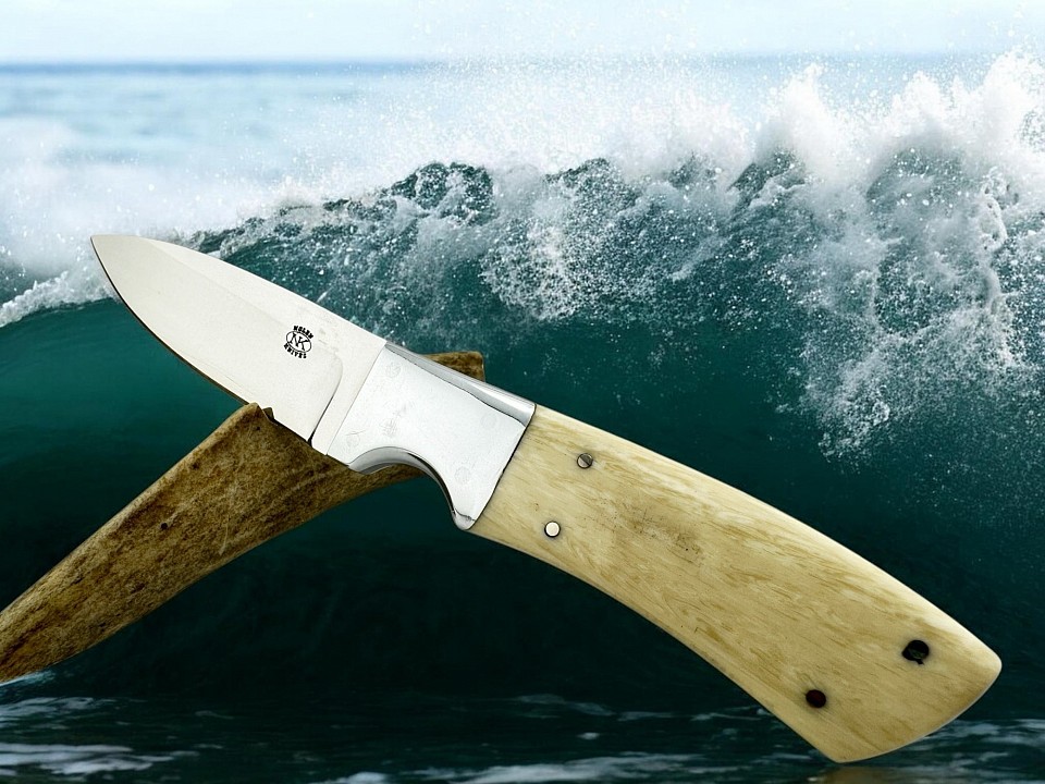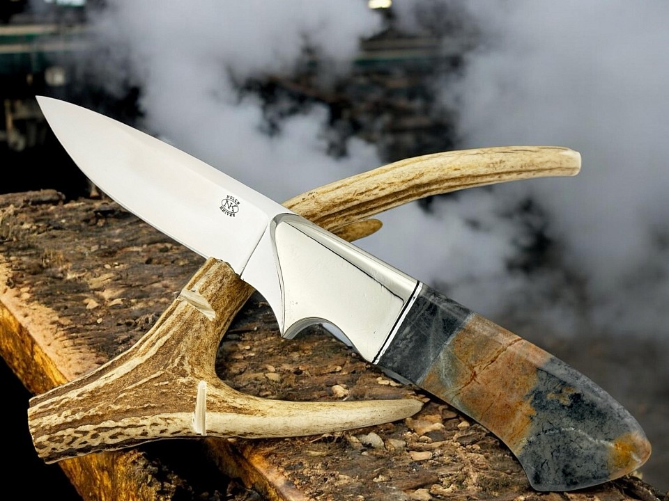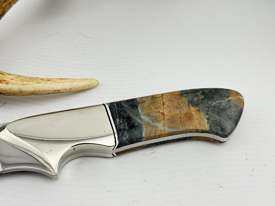 The blade is 4" with an overall length of 9". Made with 440c steel. The handle is brain coral with a nickel-silver bolster. Sheath included. $450.00 + 10.00 shipping