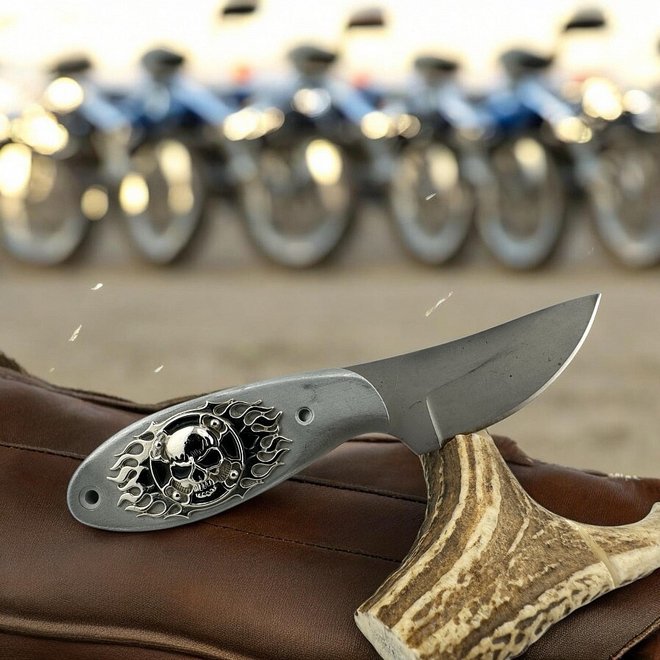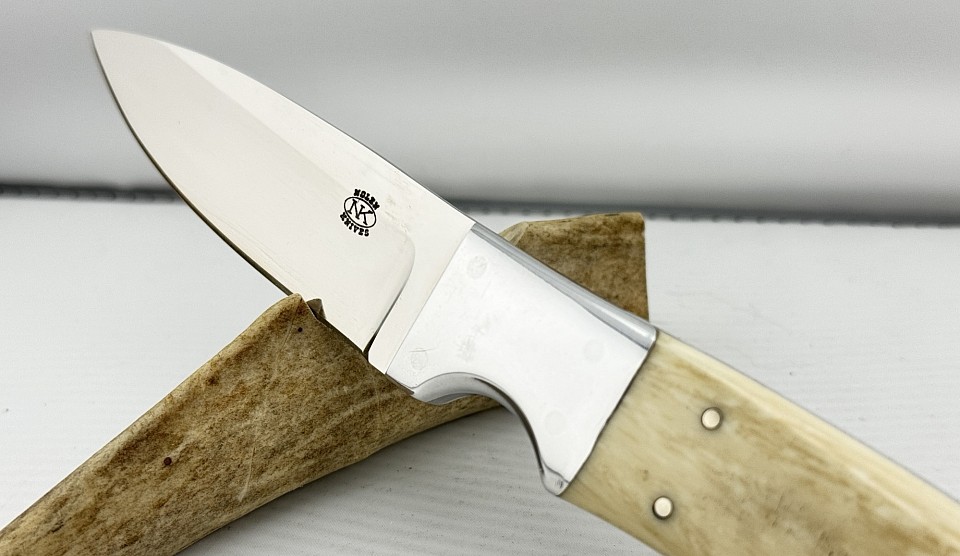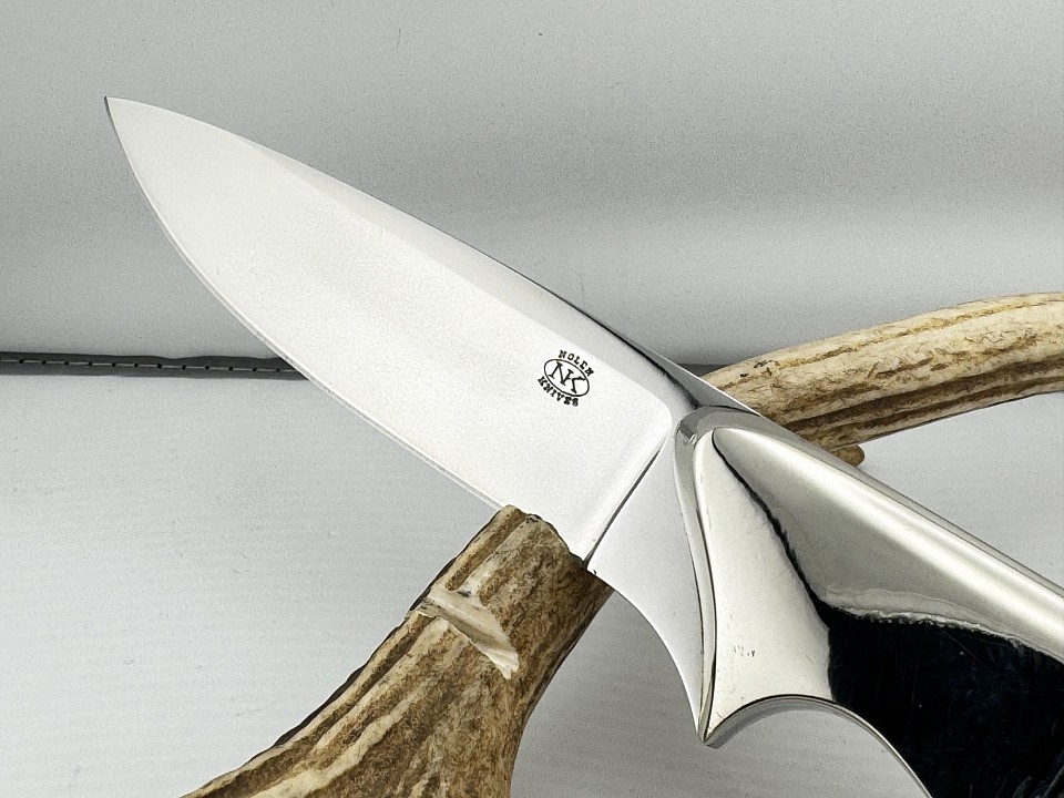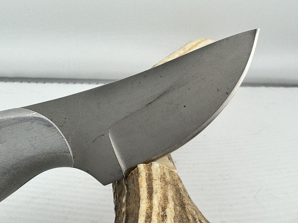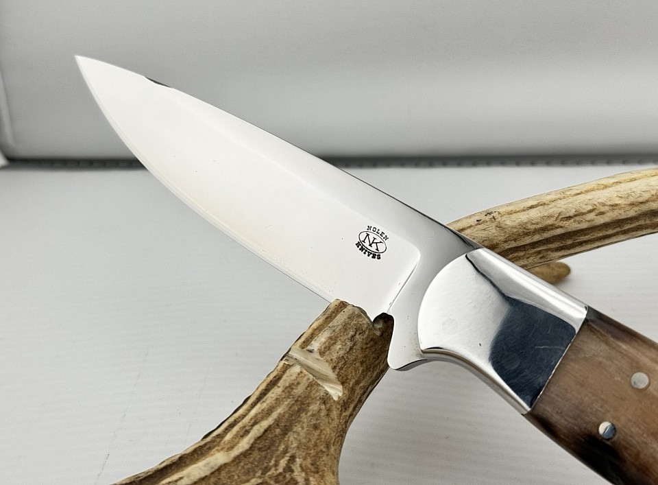 The blade is 4 1/2" with an overall length of 9". Made with 440c steel. The handle is kudu horn with an aluminum guard. Sheath included. $325.00 + 10.00 shipping
