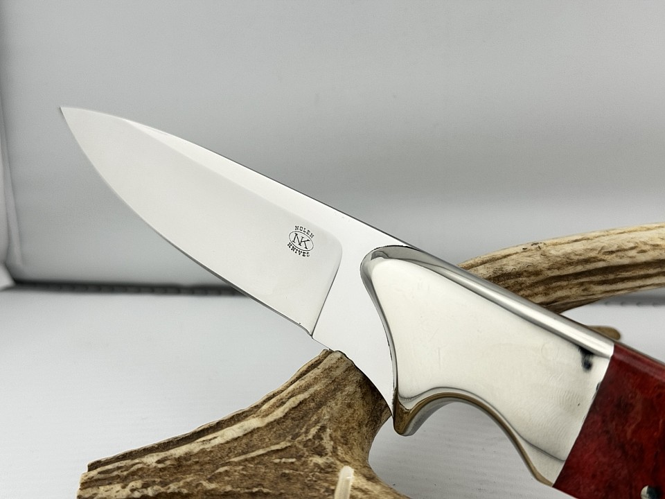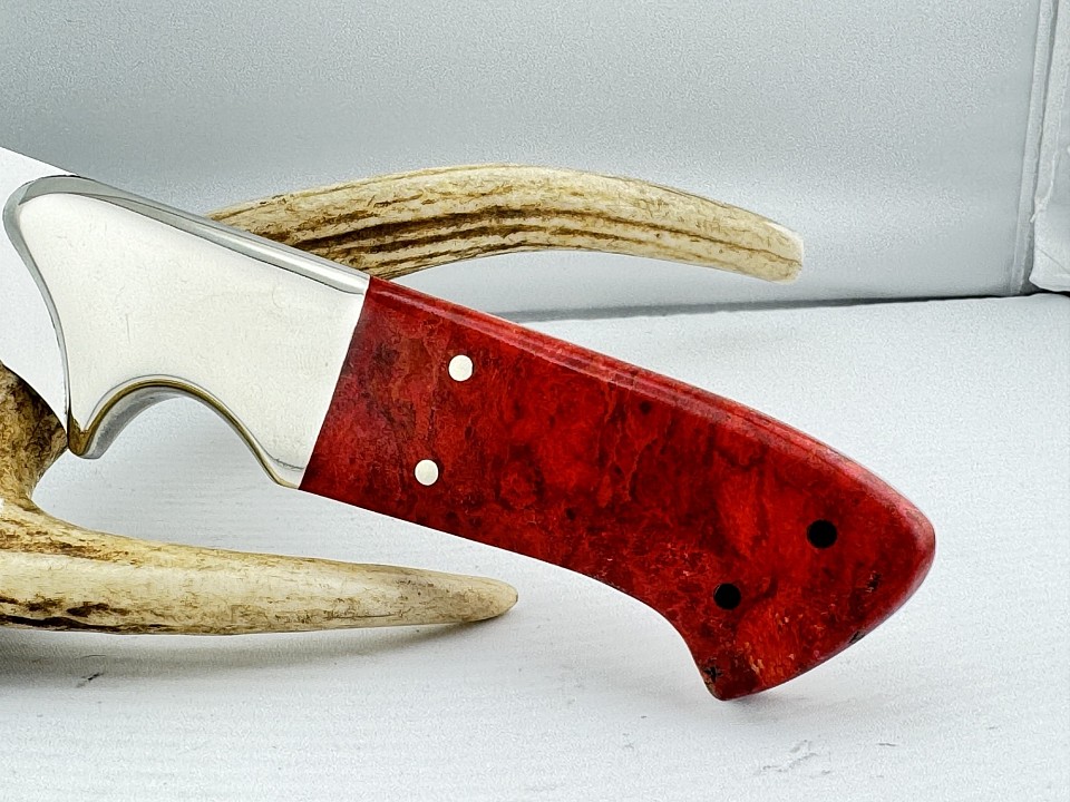 The blade is 5" with an overall length of 9 1/2". Made with 440c steel. The handle is red coral with a nickel-silver guard. Sheath included. $375.00 + 10.00 shipping