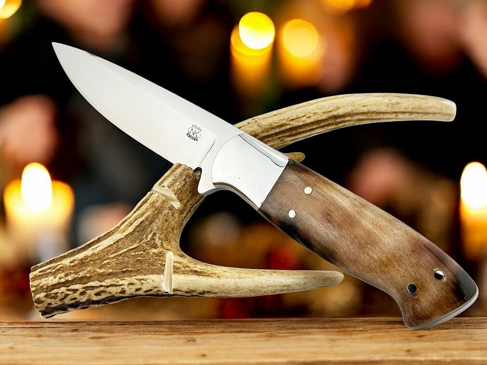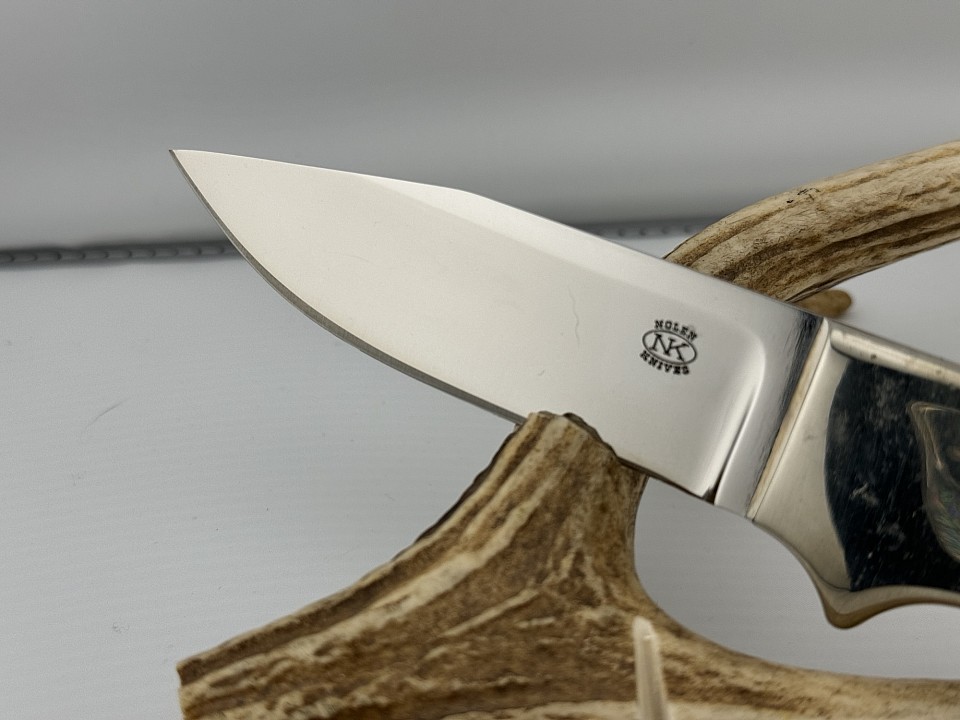 The blade is 3 7/8" with an overall length of 8 1/4". Made with 440c steel. The handle is imitation ivory with a nickel-silver bolster. Sheath included. $275.00 + 10.00 shipping