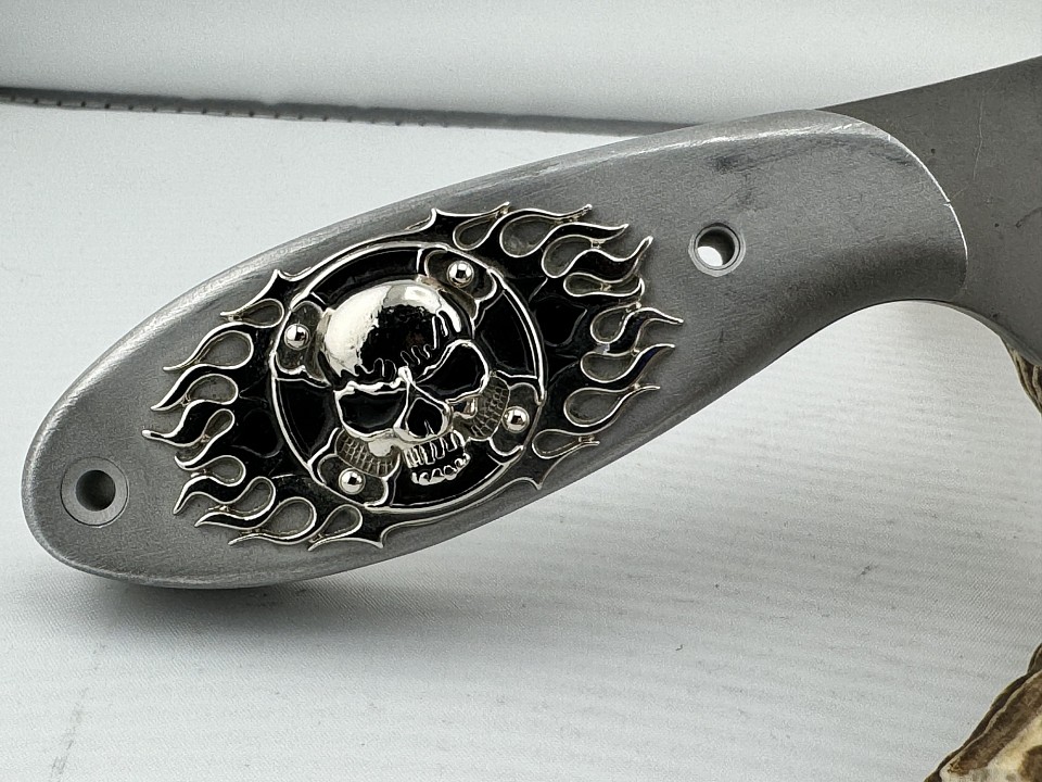 The blade is 2 1/2" with an overall length of 6". Made with 440c steel. The handle is aluminum with a bead blast finish. Sheath included. $150.00 + 10.00 shipping