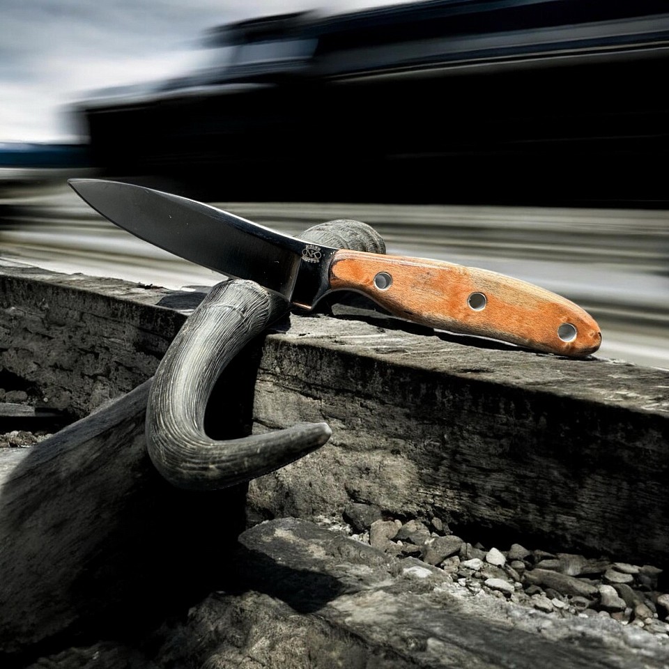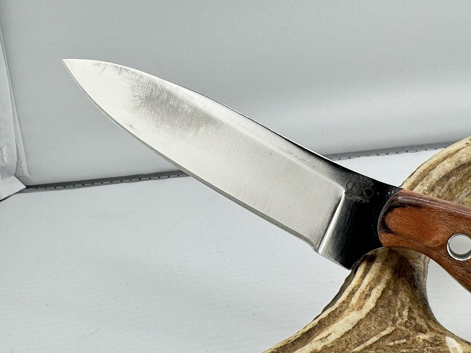 The blade is 4 3/8" with an overall length of 8 3/8". Made with 440c steel. The handle is stabilized white ash. Sheath included. $150.00 + 10.00 shipping