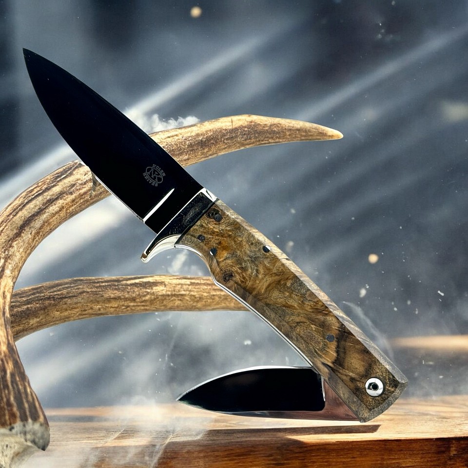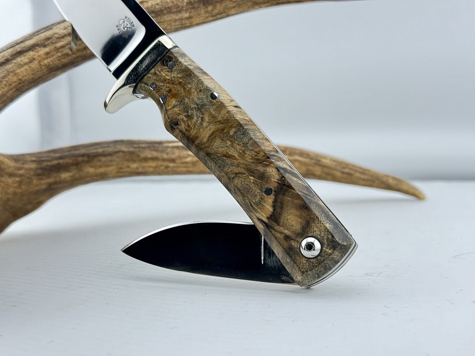 The blade is 3 1/4", the pocket knife is 2 1/4", overall length is 7 3/4". Made with 440c steel. The handle is stabilized maple burl with a nickel-silver guard. Sheath included. $600.00 + 10.00 shipping
