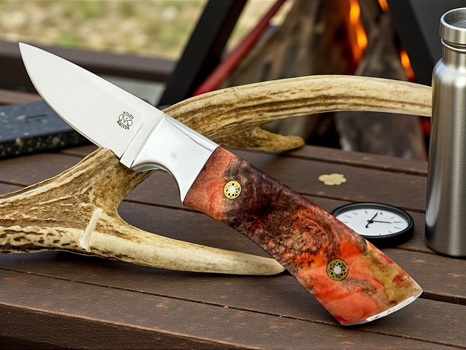 The blade is 3 1/2", the pocket knife is 2 3/4", the overall length is 11". Made with 440c steel. The handle is stabilized maple with a nickel-silver guard and aluminum bolster on the pocket knife. Sheath included. $700.00 + 10.00 shipping