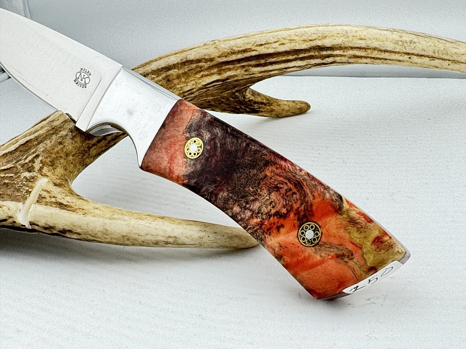 The blade is 4 1/14" with an overall length of 8 1/2". Made with Damascus steel. The handle is stabilized maple burro. Sheath included. $270.00 + 10.00 shipping
