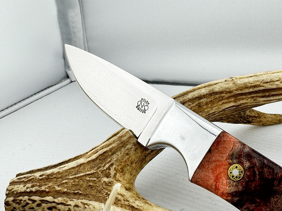 The blade is 3 1/2" with an overall length of 8". Made with 440c steel. The handle is stabilized California buckeye with an aluminum bolster. Sheath included. $250.00 + 10.00 shipping