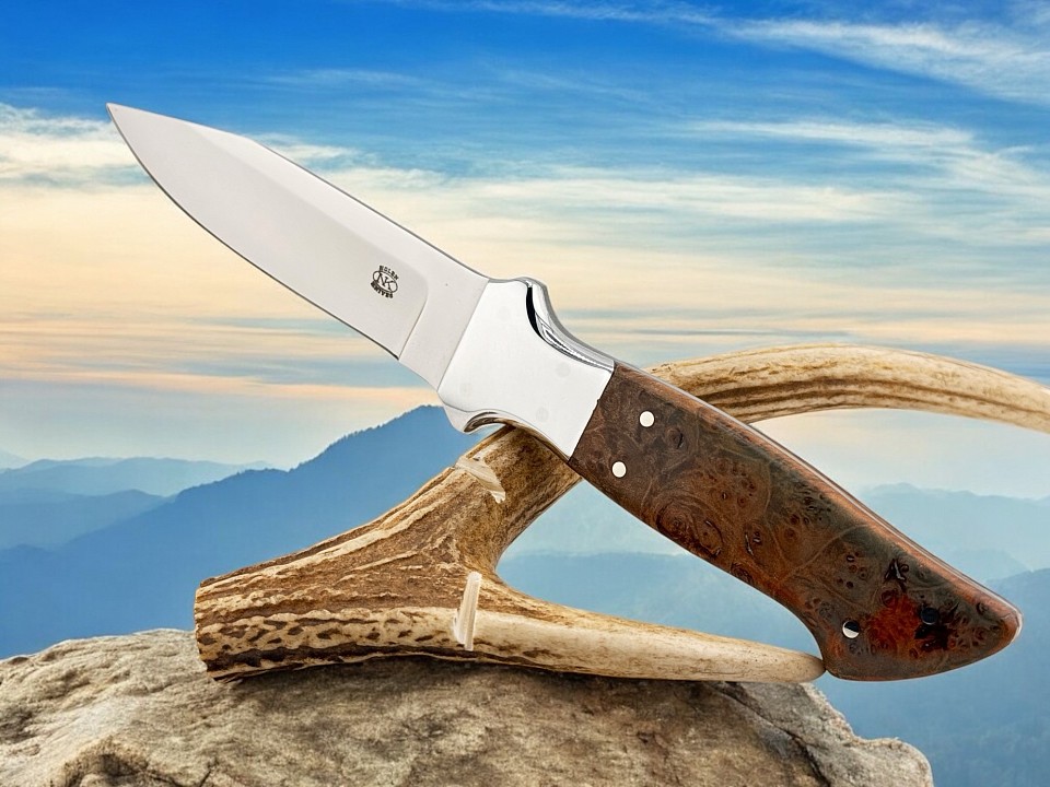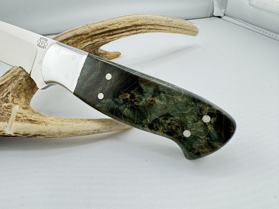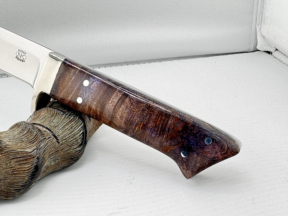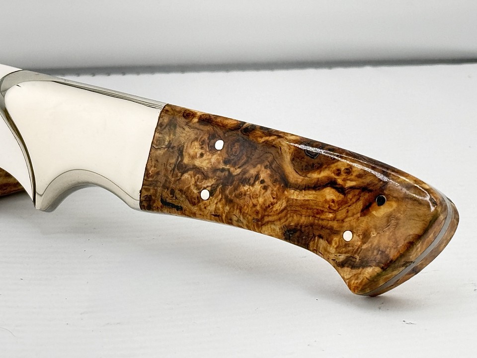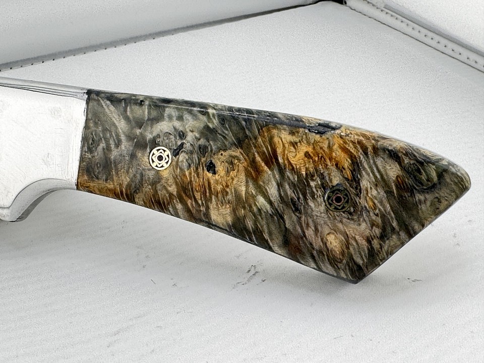 The blade is 4" with an overall length of 9". Made with 440c steel. The handle is stabilized birdseye maple with a nickel-silver bolster. Sheath included. $380.00 + $10.00 shipping