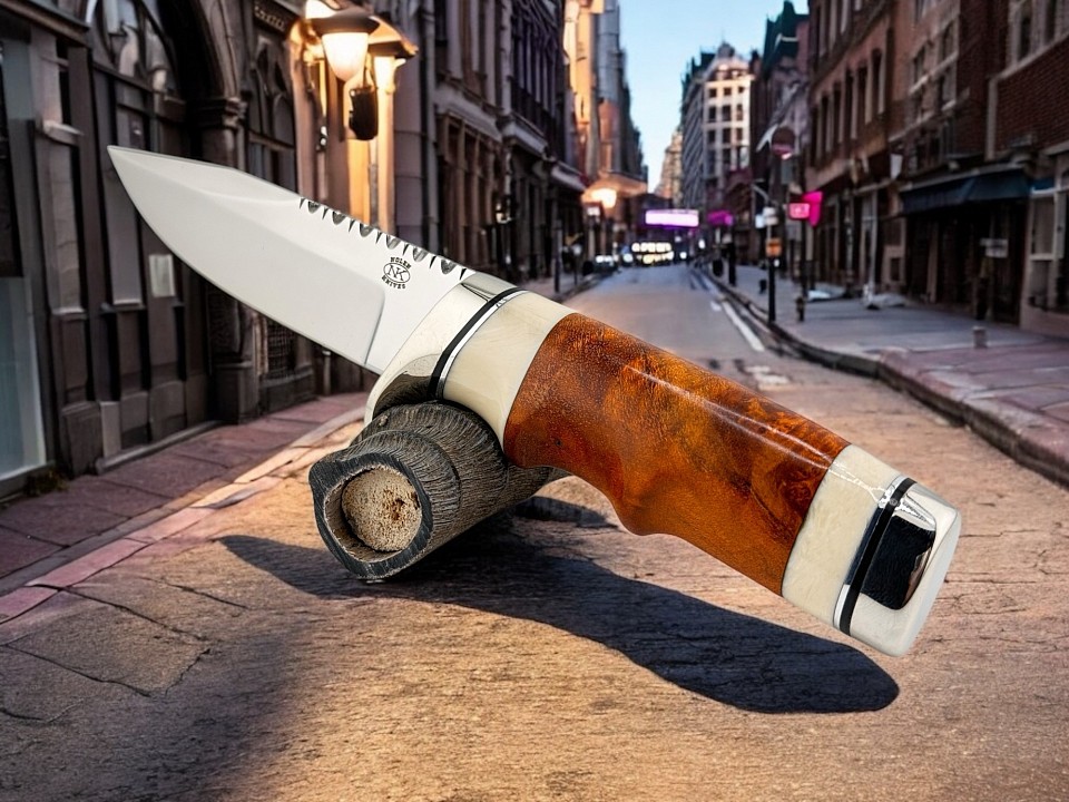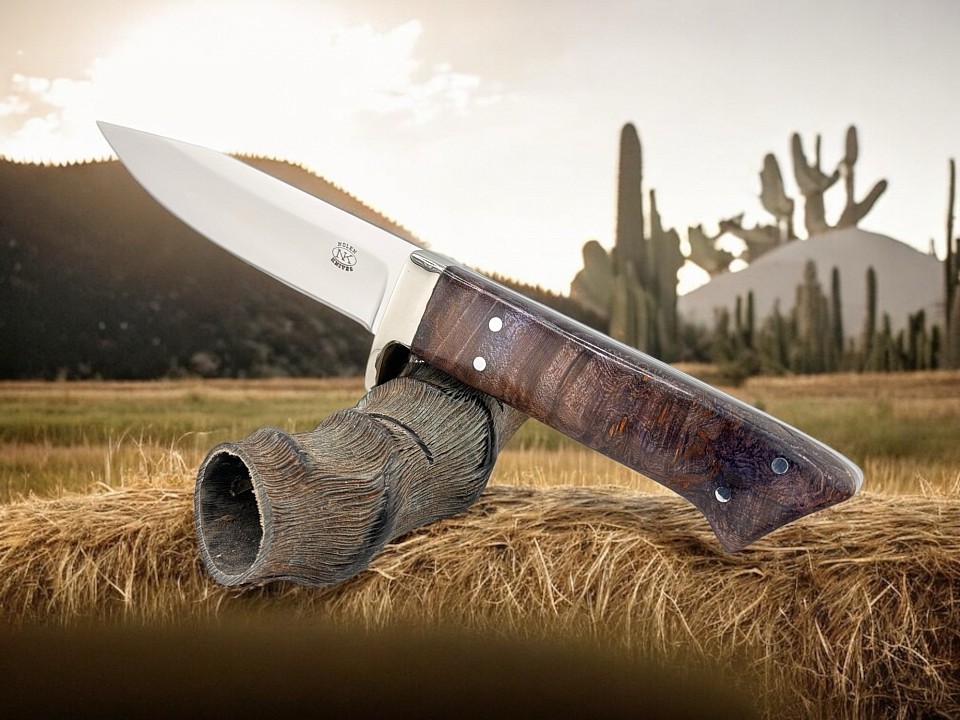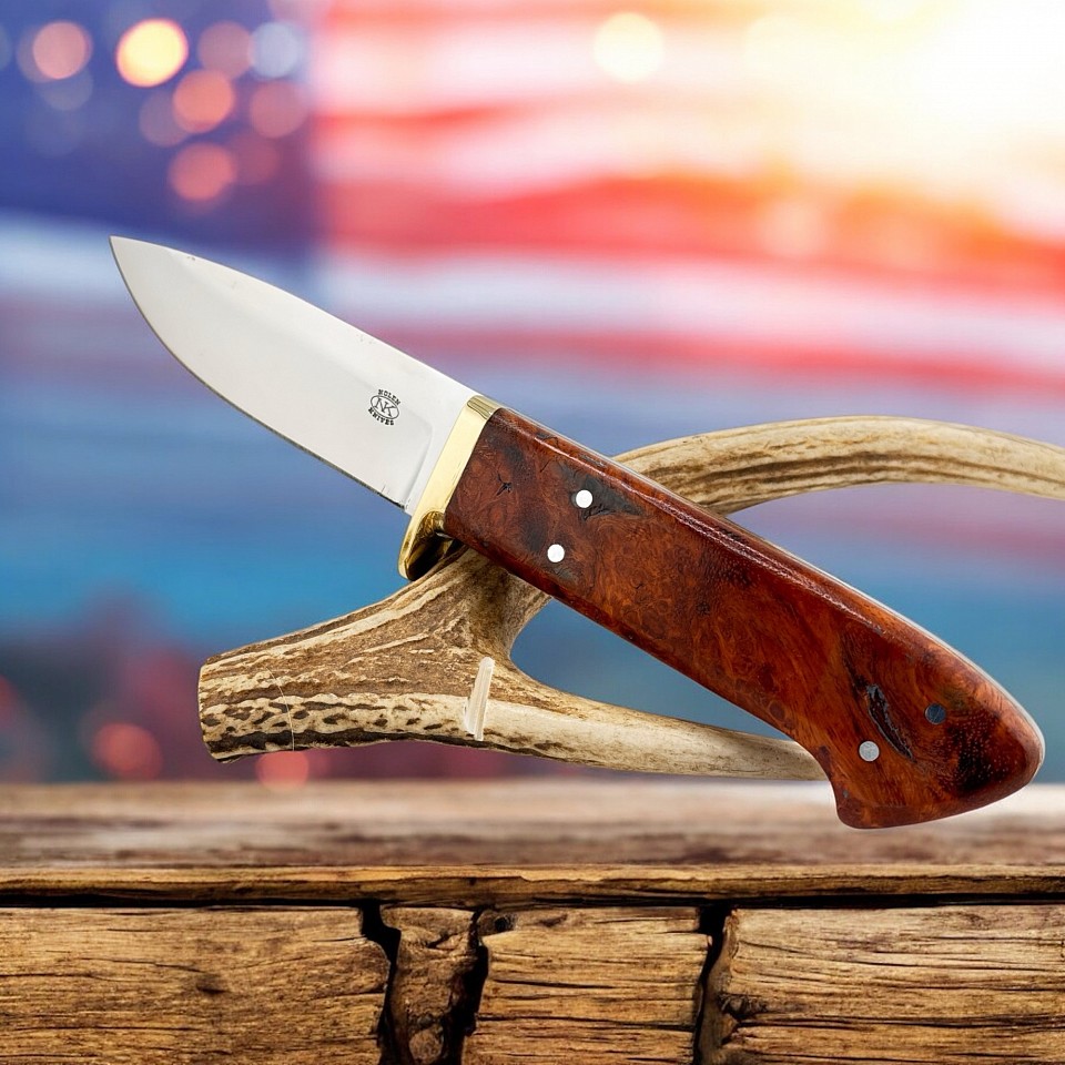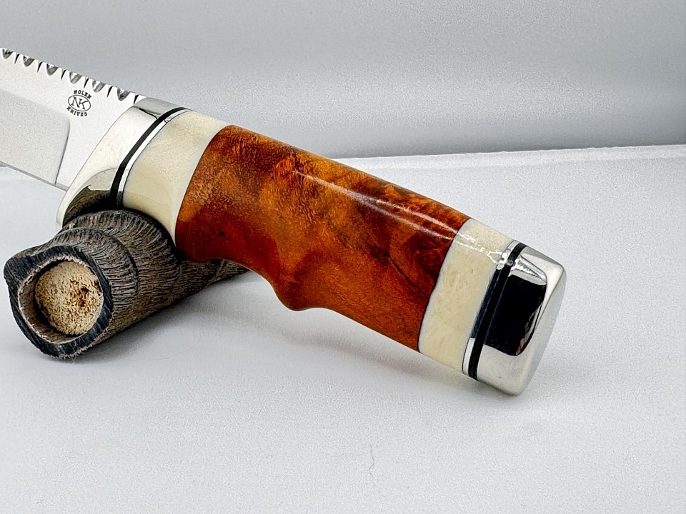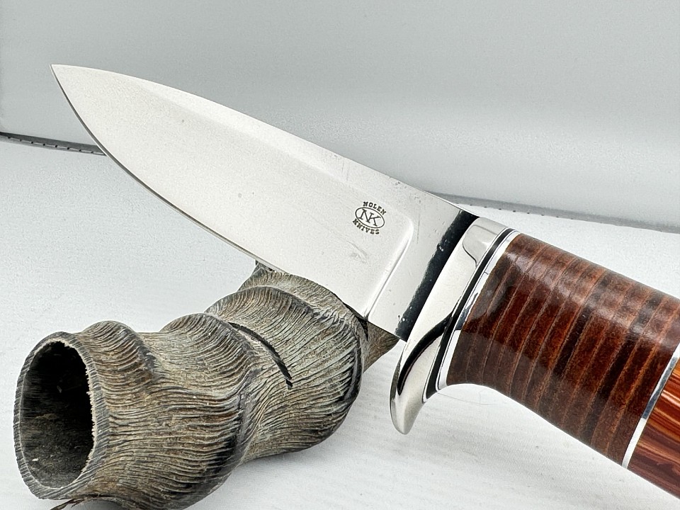 The blade is 4" with an overall length of 9". Made with 440c steel. The handle is stabilized birdseye maple with a nickel-silver bolster. Sheath included. $380.00 + $10.00 shipping