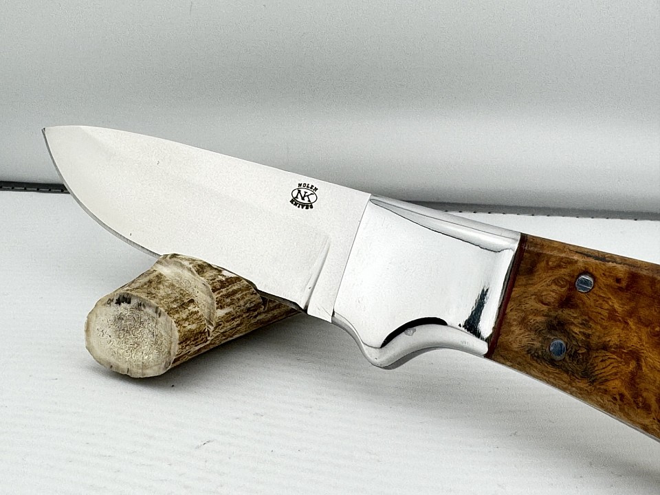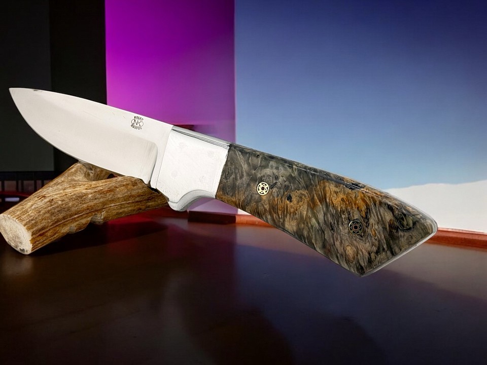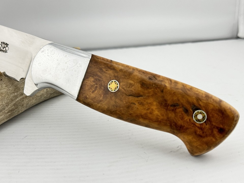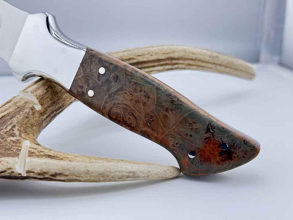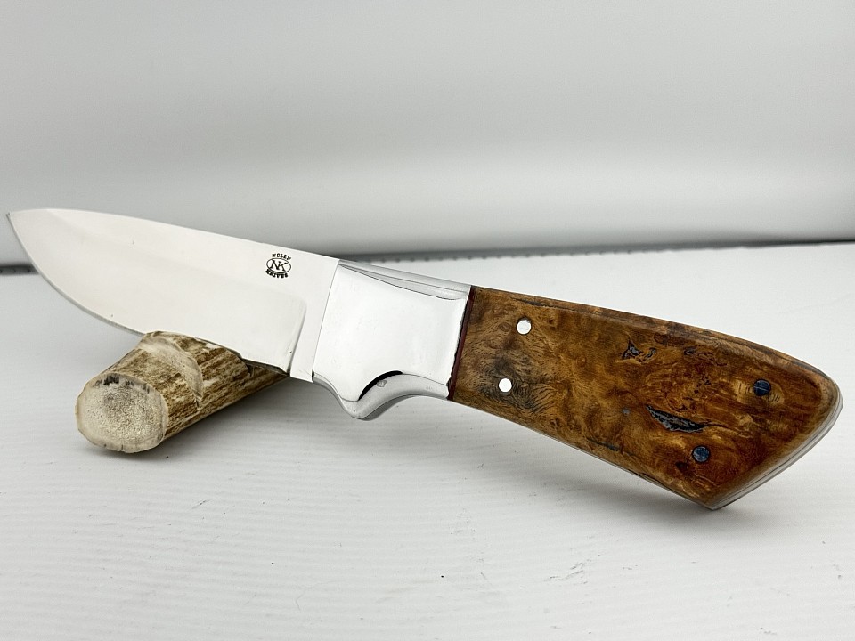 The blade is 4 1/2" with an overall length of 9 3/8". Made with 440c steel. The handle is stabilized birds-eye maple with a nickel-silver bolster. Sheath included. $325.00 + 10.00 shipping