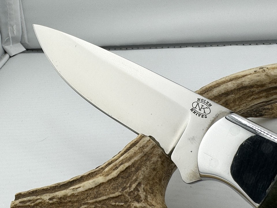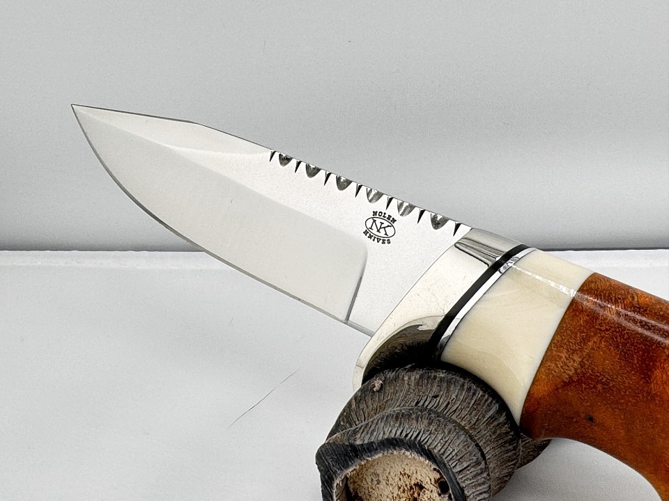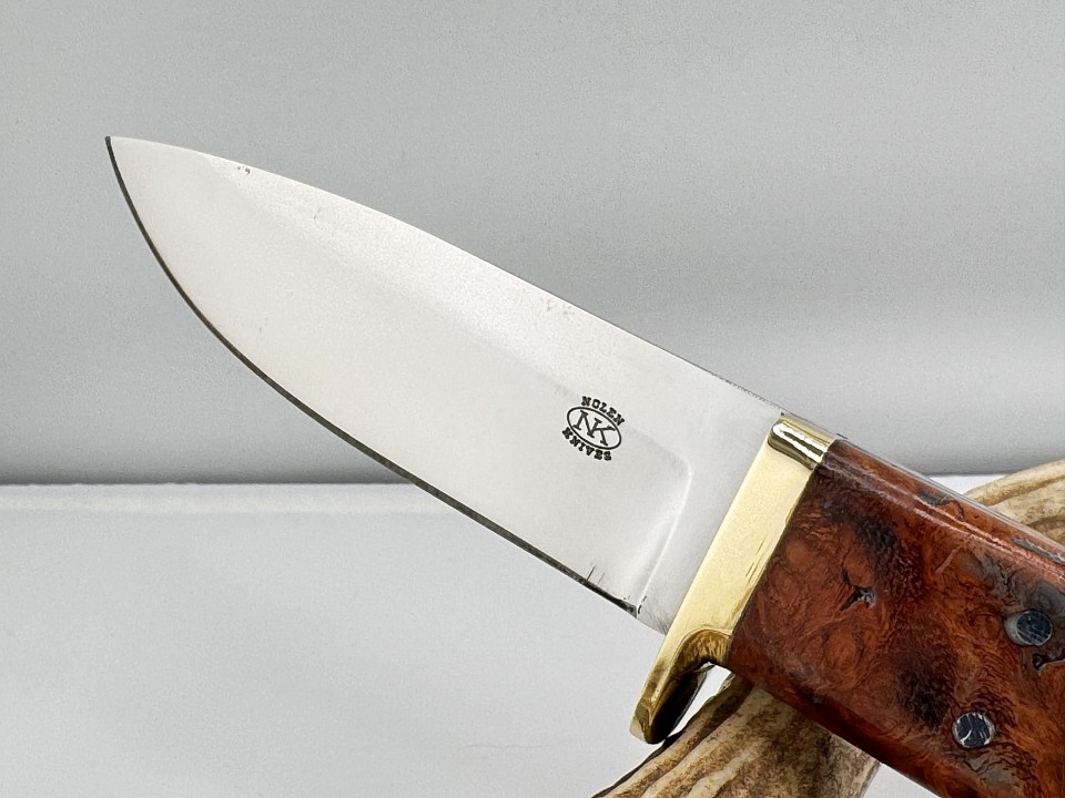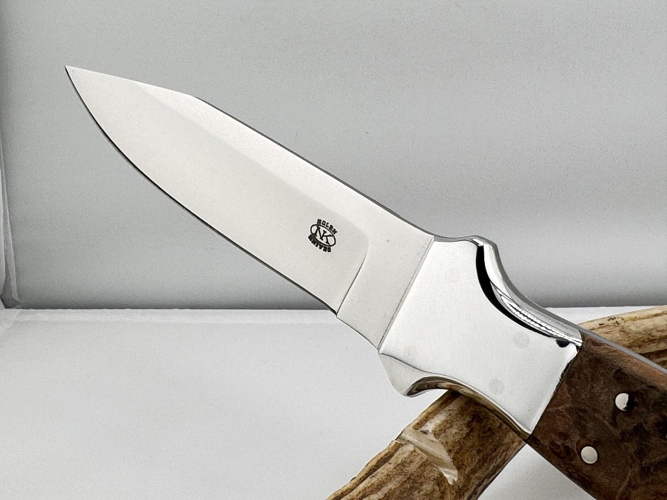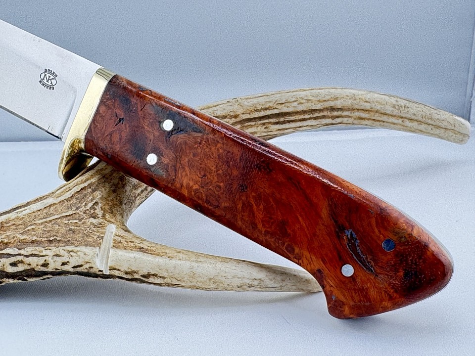 The blade is 4 1/2" with an overall length of 9 3/8". Made with 440c steel. The handle is stabilized birds-eye maple with a nickel-silver bolster. Sheath included. $325.00 + 10.00 shipping