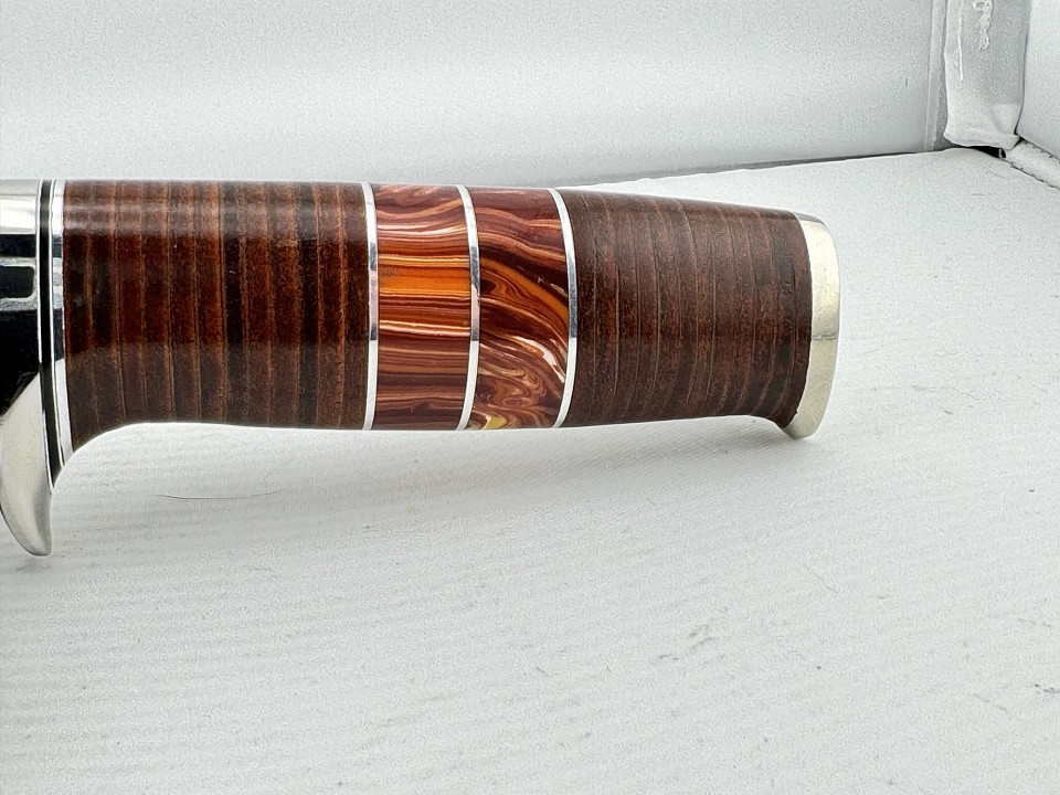 The blade length is 5" with an overall length of 9 3/8". Made with 440c steel. The handle material is leather spacers with red coral and nickel-silver guard and butt cap. Sheath included. $375.00 + 10.00 shipping